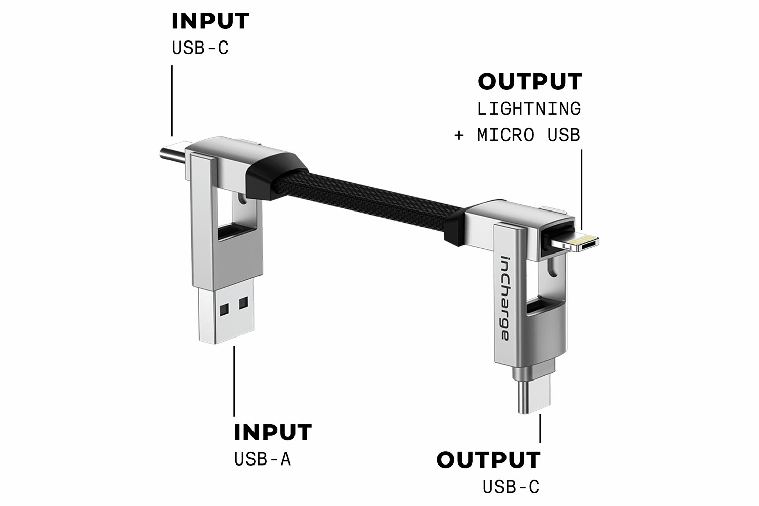 The inCharge 6 patented design allows to charge any portable device from any power source: - USB-A to USB-C.
