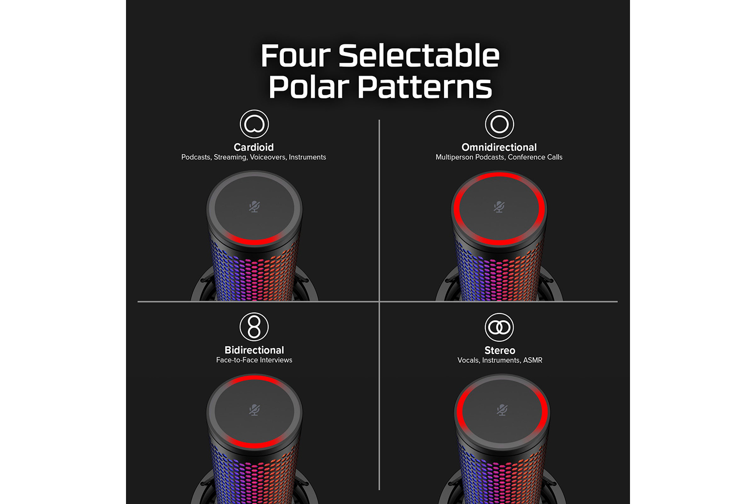 QuadCast 2 S offers four polar patterns (cardioid, omnidirectional, bi-directional, or stereo) to fit a wide variety of recording needs.