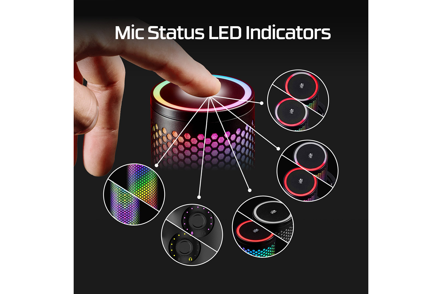 1. Based on all USB microphone’s that are advertised for gaming and have at least two of the following: USB connection, built-in control and mute, and direct monitoring output in the market as of 08/2024. Customization is measured by addressable RGB lighting.