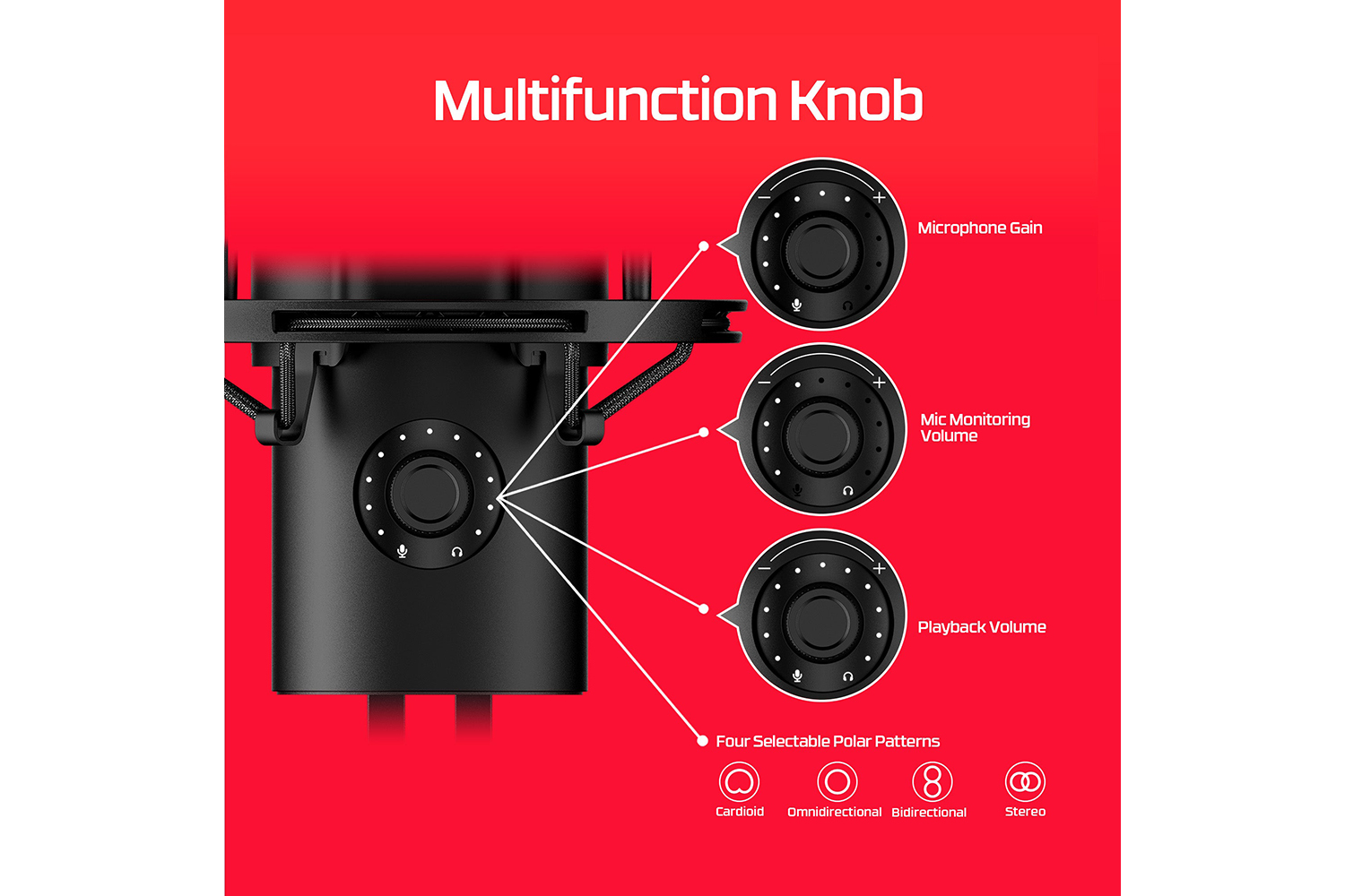The multifunction knob lets you quickly and easily adjust your microphone gain, playback volume, monitoring volume, and switch between 4 polar patterns.