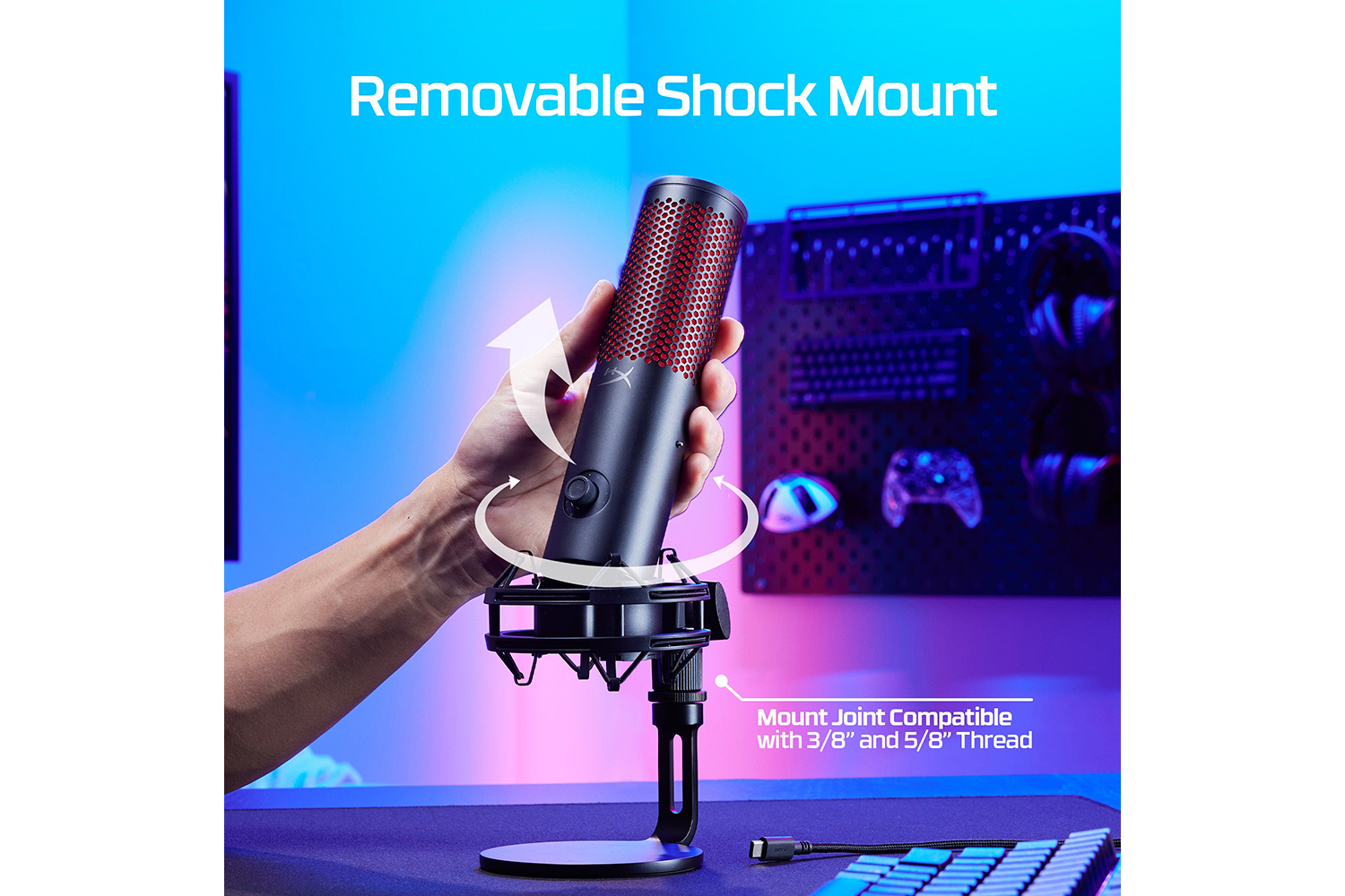 The pre-attached vibration-dampening shock mount is easily detachable thanks to the spring-loaded pins. The shock mount joint is also compatible with 3/8” and 5/8” threading, for easy setups.