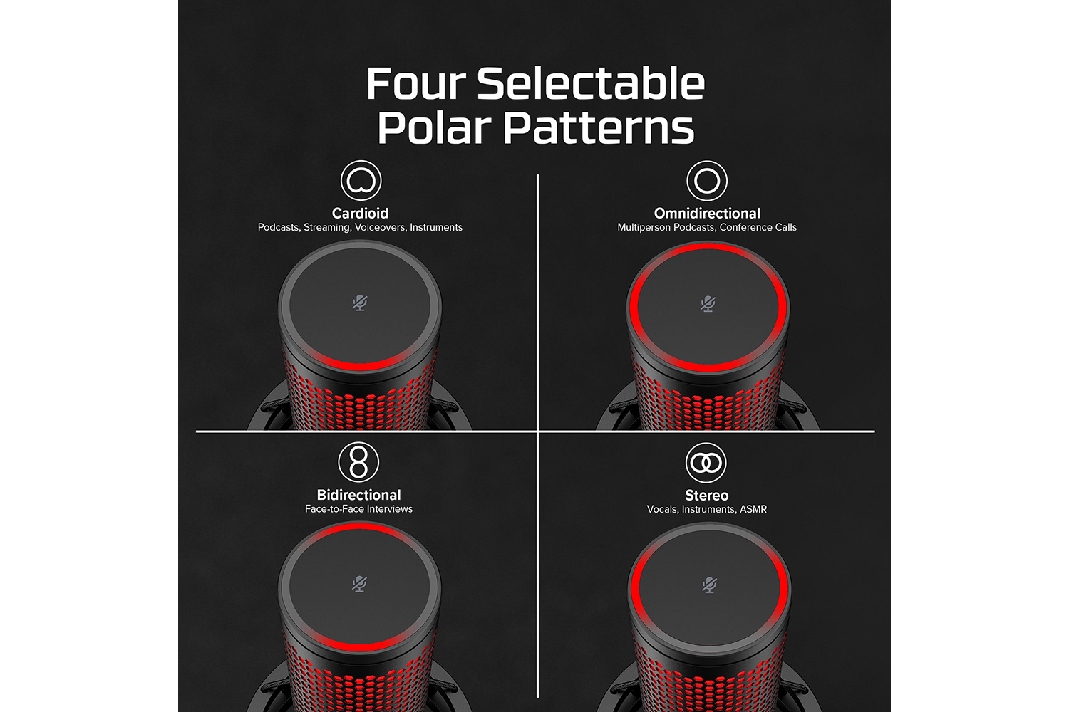 Optimize your recording by selecting whichever of the versatile QuadCast 2’s polar patterns (cardioid, omnidirectional, bi-directional, or stereo) best suits your audio capture needs.