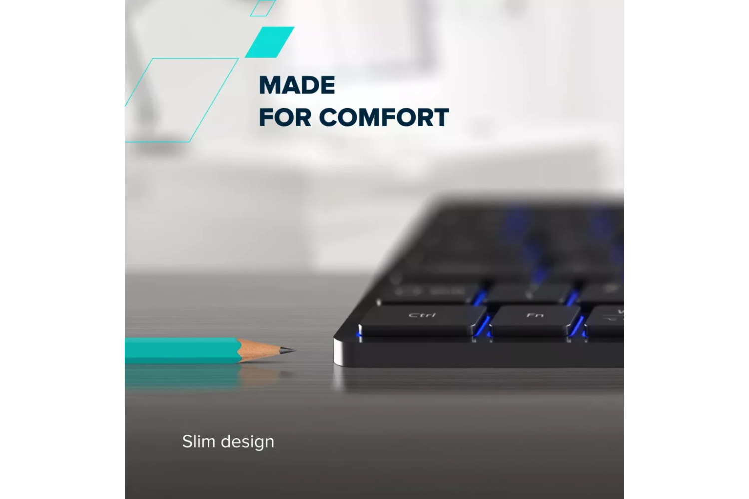 Created with ergonomics in mind, the ultra-slim profile provides a sleek and lightweight feel, making typing more natural and reducing wrist strain. The compact yet full-size layout will maximize comfort and efficiency when you're working at a desk or on the go.