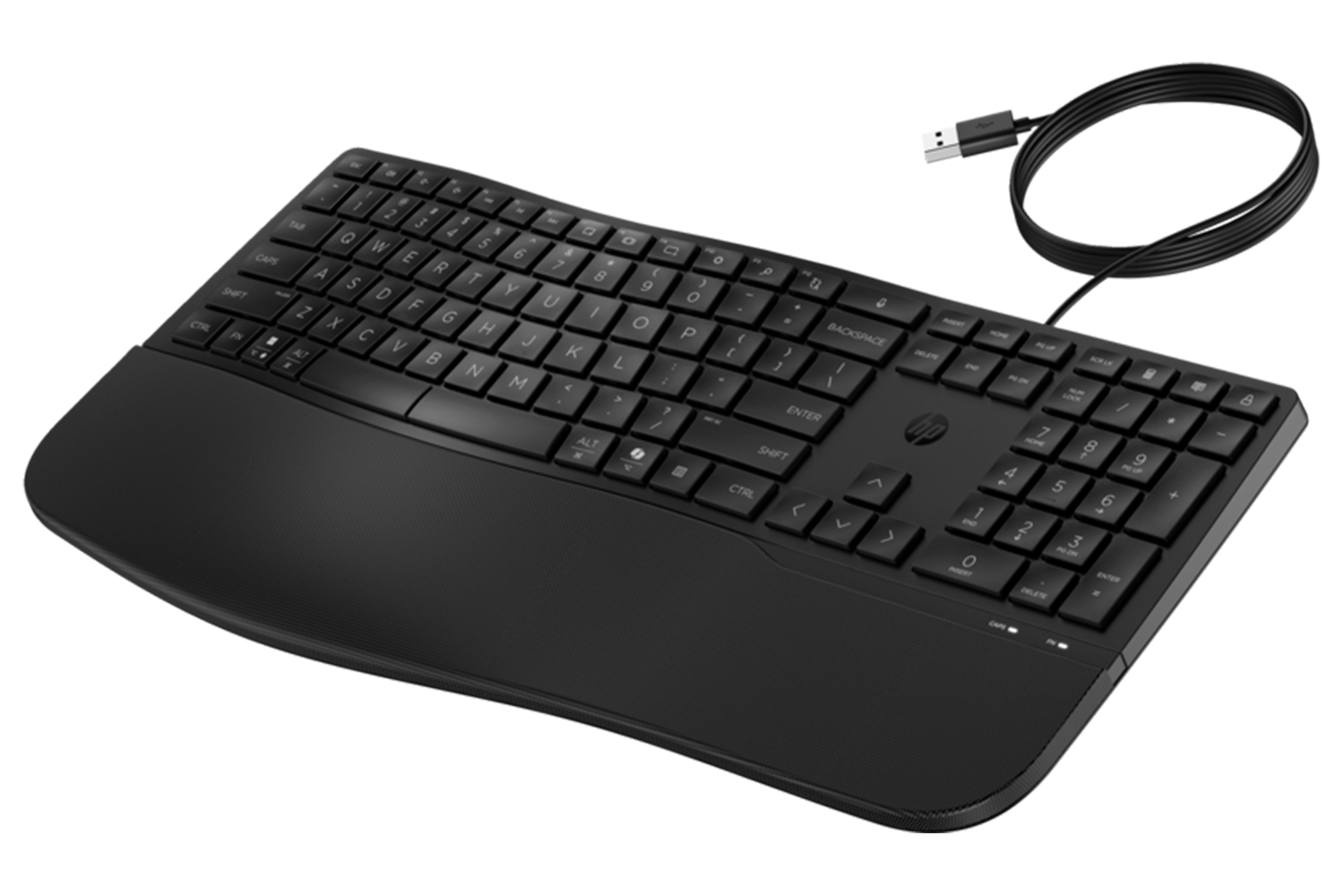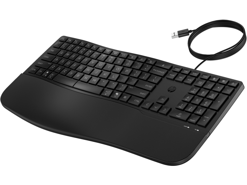 From blogging to coding, the HP 480 Comfort Wired Keyboard is designed for natural comfort and all-day productivity. Its familiar layout delivers ergonomic benefits through a wave-like shape, quiet keycaps, and a soft cushioned palm rest.