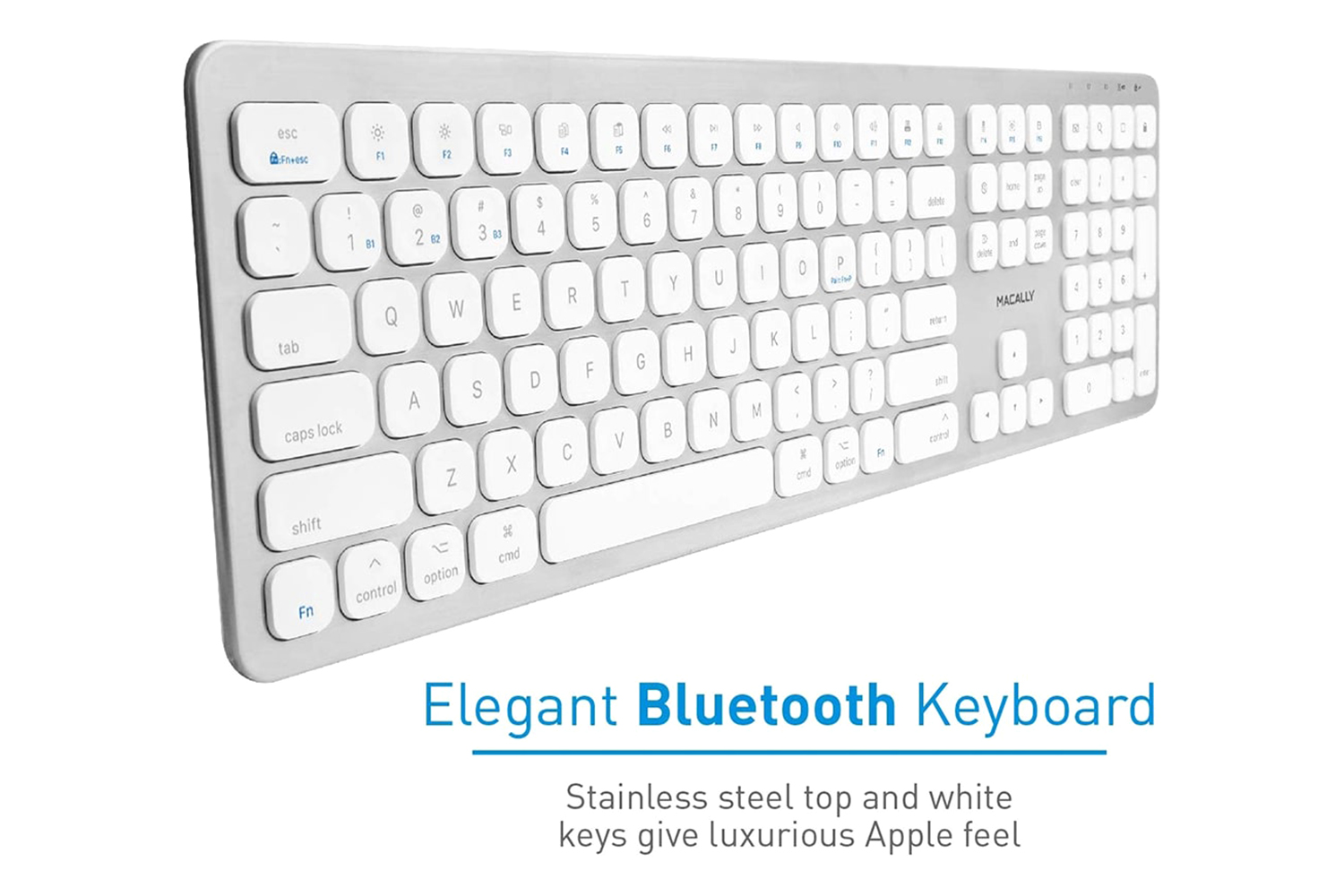The Macally BTWKEYMB is a stylish Bluetooth wireless keyboard with a brushed stainless steel top finish and concave keycap design, especially designed for any Bluetooth equipped Apple Mac, iPad and iPhone.