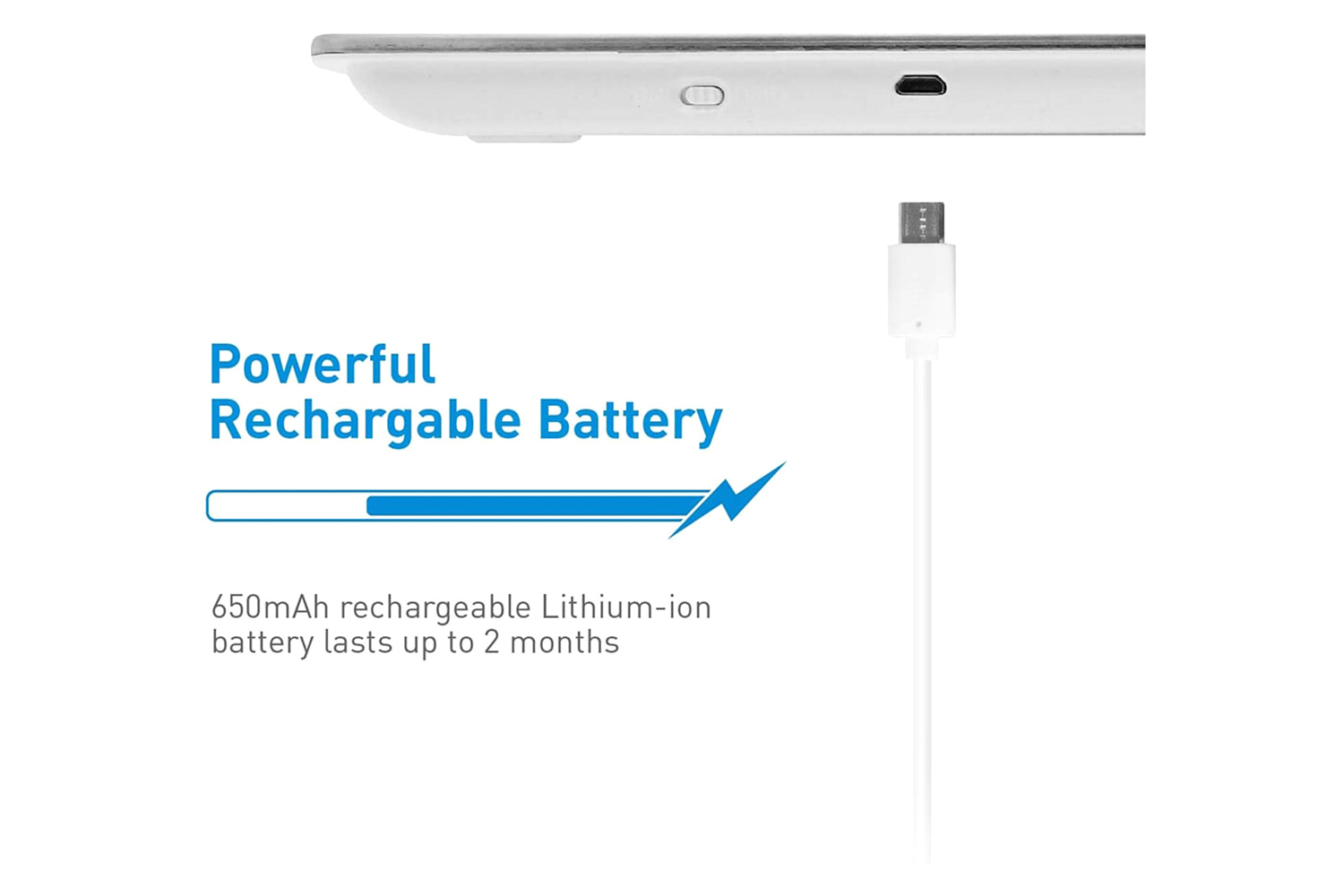 Built-in 650 mAh rechargeable Lithium-ion battery lasts up to 2 months on one charge (hassle-free, no need to replace batteries).