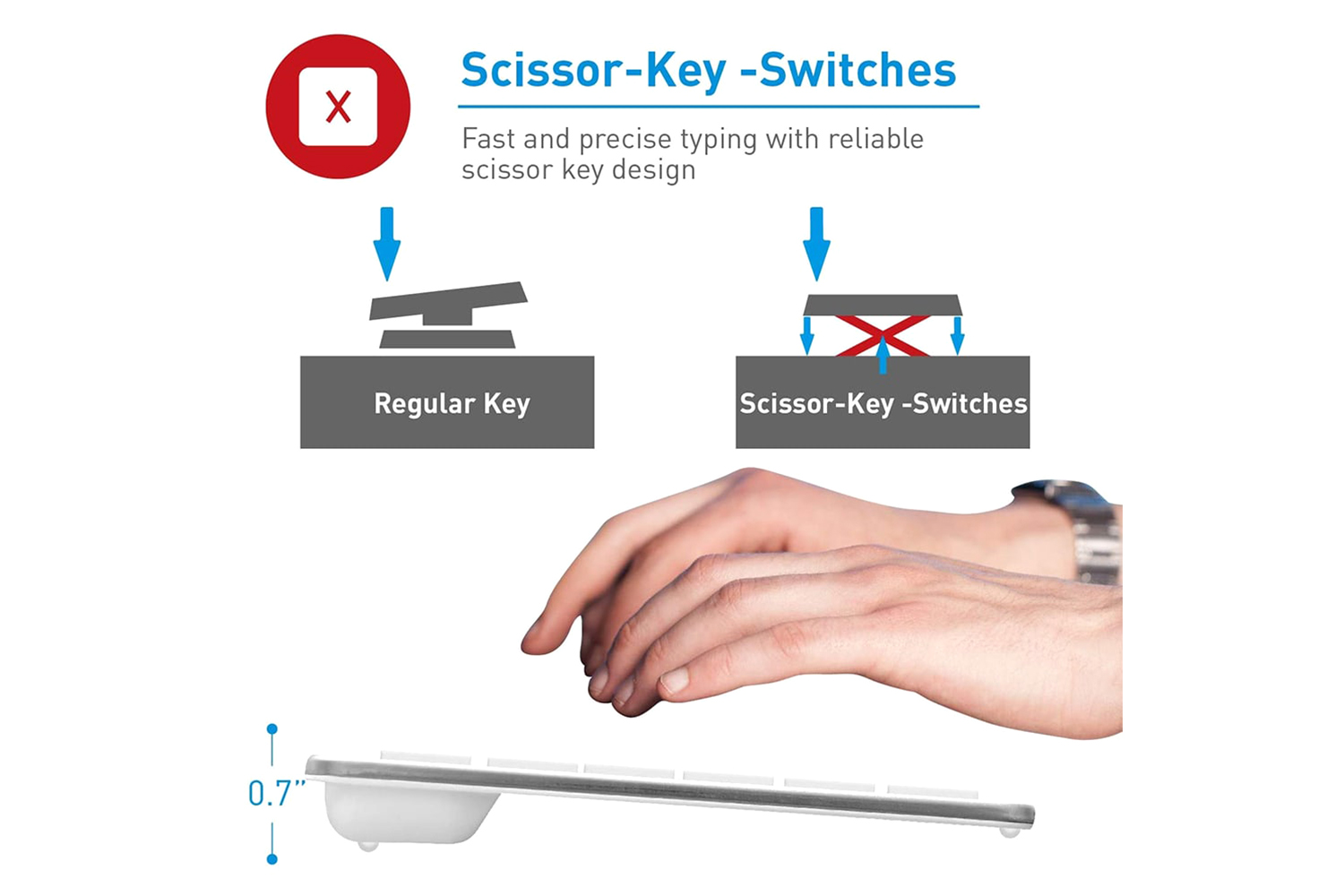 110 full size, thin and quiet Scissor-Switch keys with a concave design for a sensitive and responsive touch.