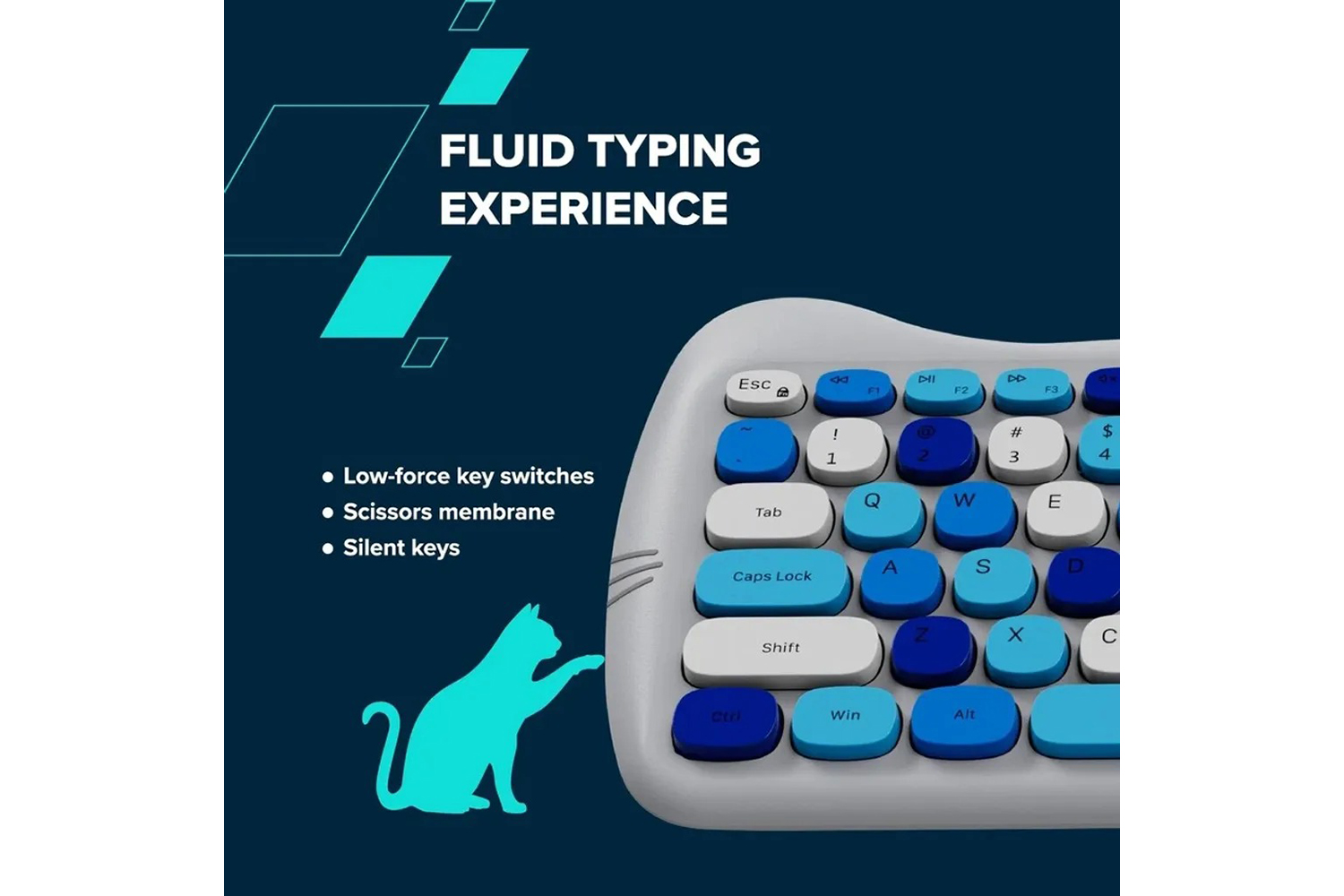 This combo includes a matching keyboard and mouse with adorable feline-inspired details. The sleek design is accented with lovely bright hues, adding a touch of elegance to your desktop. A luxurious protective sleeve is included with the set to keep it safe when not in use.