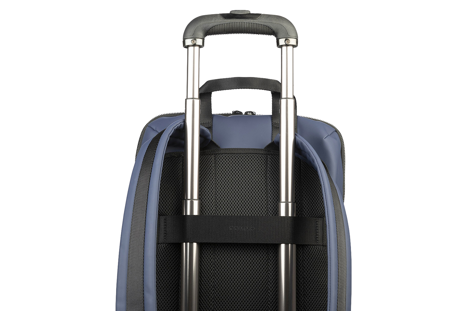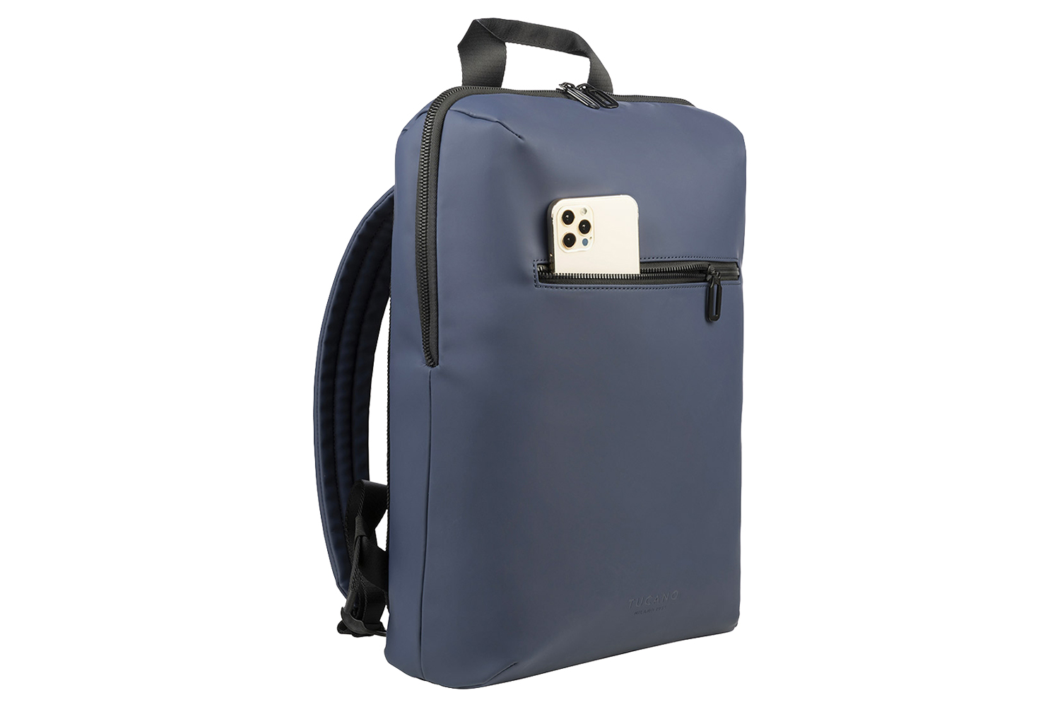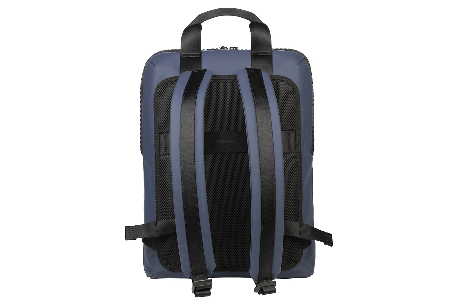 Backpack featuring a minimal-sporty design for 15.6" laptops and 16" MacBooks, in rubberized material. Equipped with a large single compartment, the Gommo backpack has an internal pocket for laptops and an external pocket for accessories. It also features a breathable mesh back as well as a convenient trolley strap.