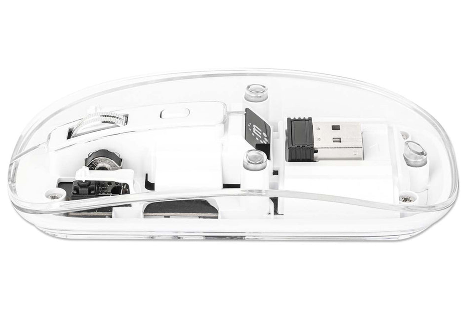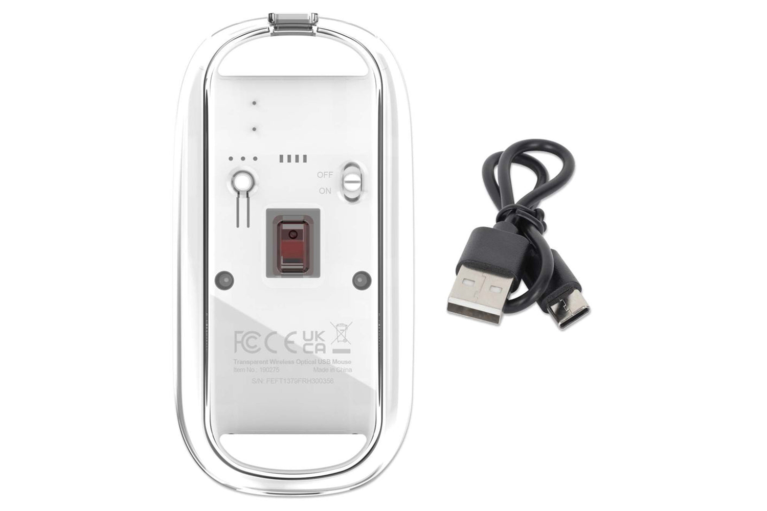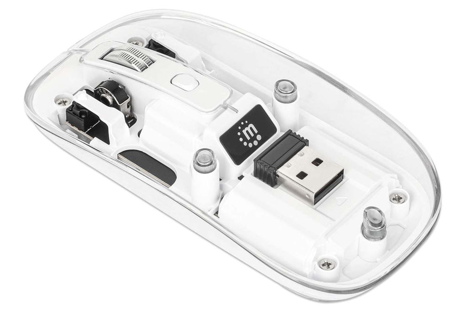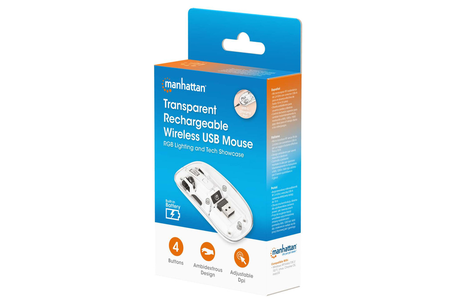 The Manhattan Transparent Wireless Optical USB Mouse is your attractive blend of style and functionality. Its transparent shell on a sleek silhouette showcases its components while the logo changes its colors in dynamic RGB light. The optical sensor immerses the mouse’s entire edge in a stylish red.