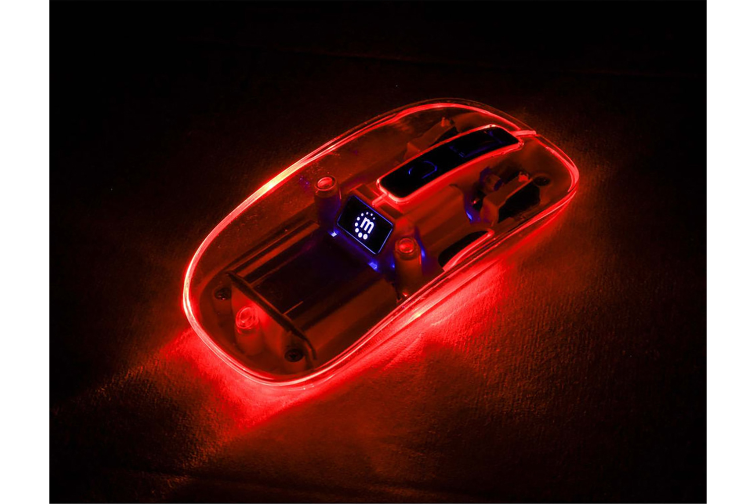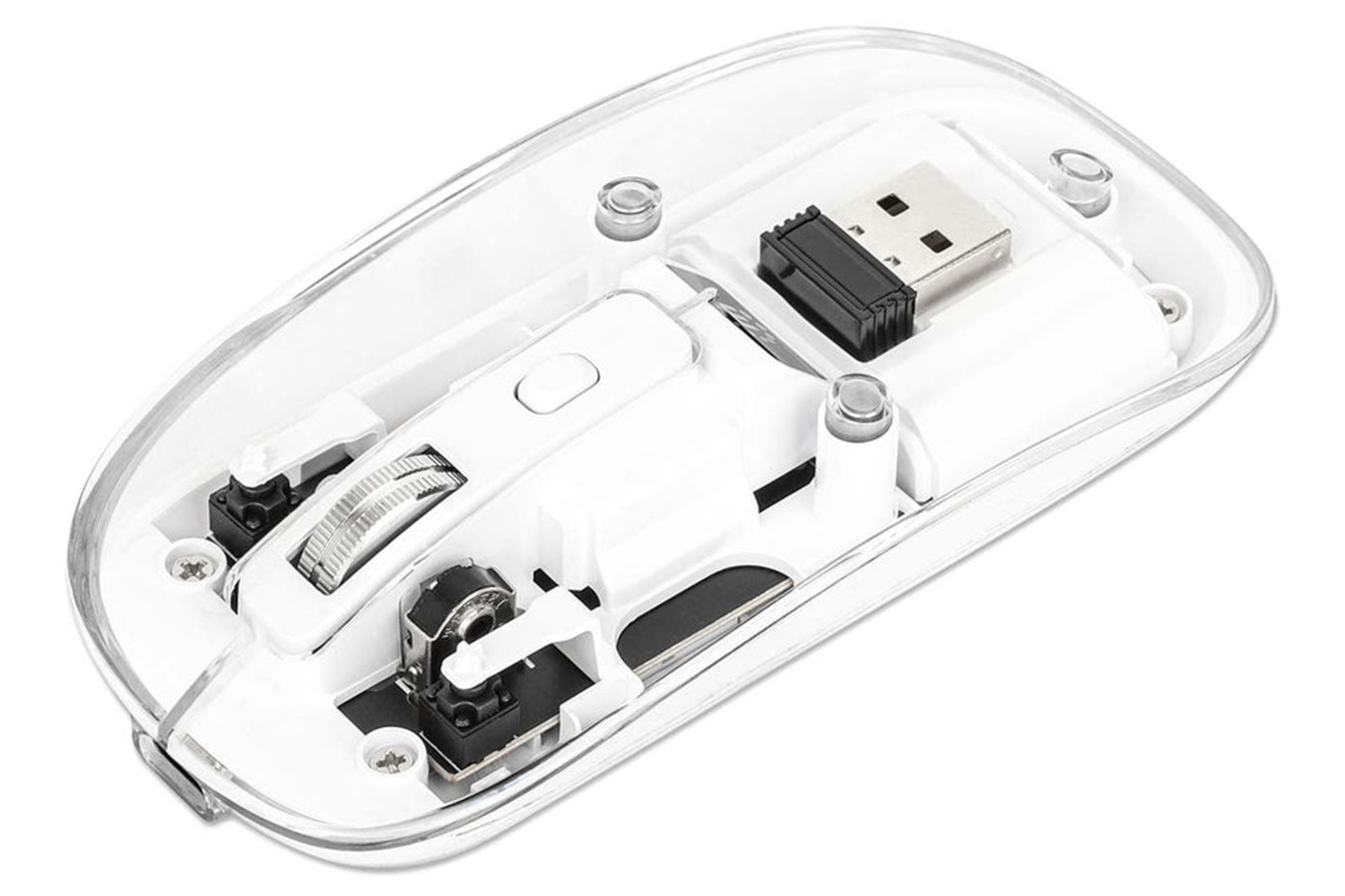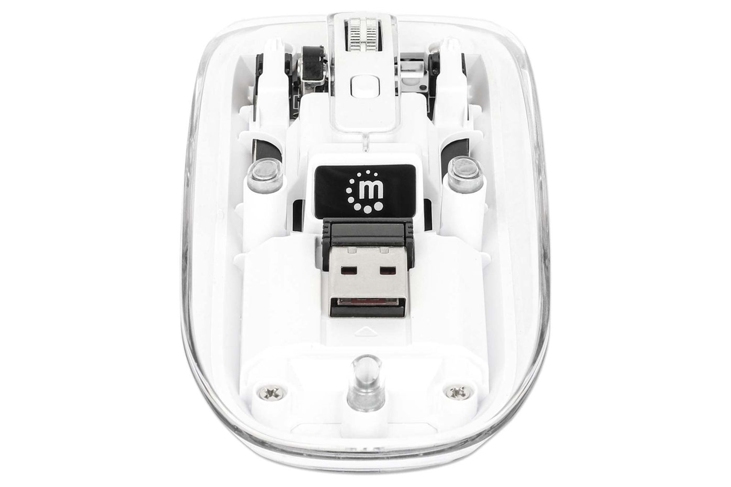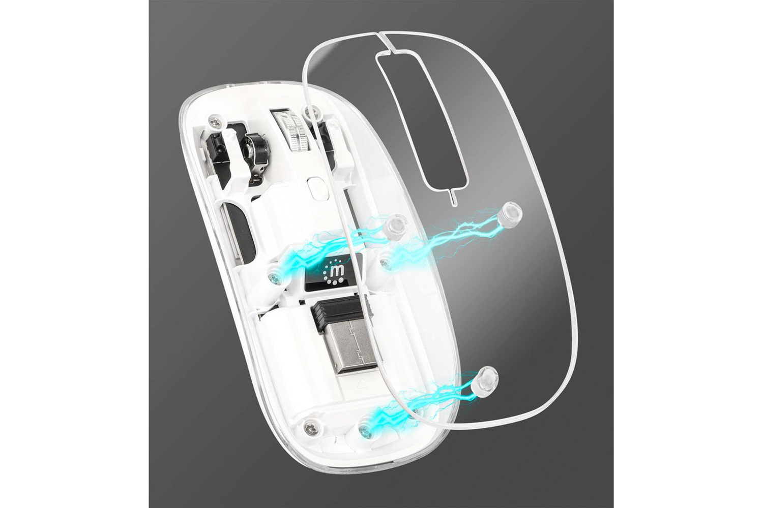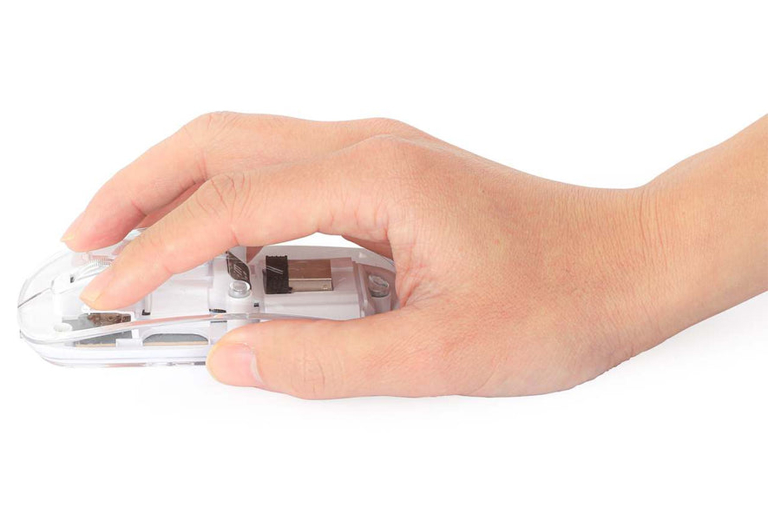 The Manhattan Transparent Wireless Optical USB Mouse is your attractive blend of style and functionality. Its transparent shell on a sleek silhouette showcases its components while the logo changes its colors in dynamic RGB light. The optical sensor immerses the mouse’s entire edge in a stylish red.