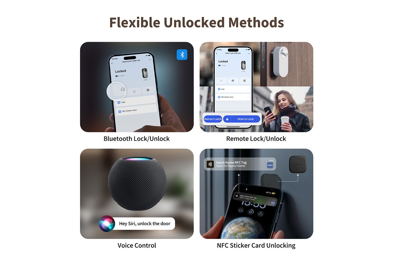 Flexible Unlock MethodsThe Aqara U200 Lite supports Bluetooth proximity unlock via the Aqara app, decreasing the need for a mechanical key. You can touch your phone to the complimentary NFC Sticker Card to quickly launch the Aqara app or just open the app to access the unlock button on your phone. Additionally, the U200 Lite supports remote unlocking through the app*, which is convenient when you’re away from home. It’s also compatible with Siri and Alexa voice commands, allowing for seamless smart unlocking experiences*.
