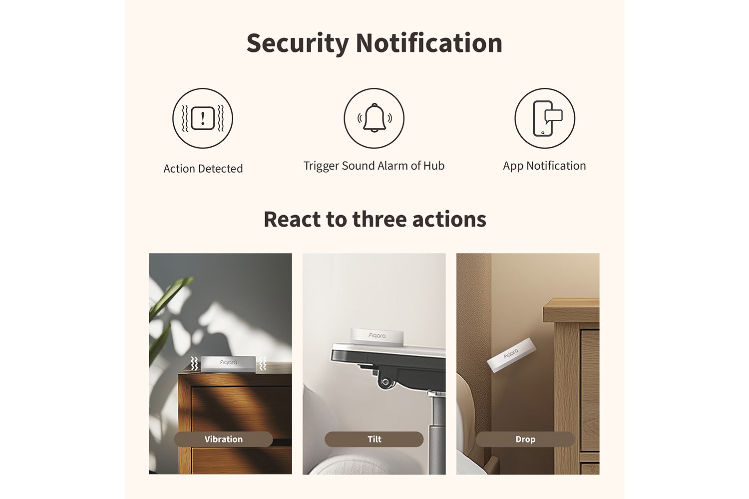 The Aqara Vibration Sensor T1 is embedded with a high precision acceleration sensor, and it detects vibrations, tilting, and drops of the objects it’s attached to. It’s perfect for security, acting as an alarm or triggering automation to safeguard your home and belongings.