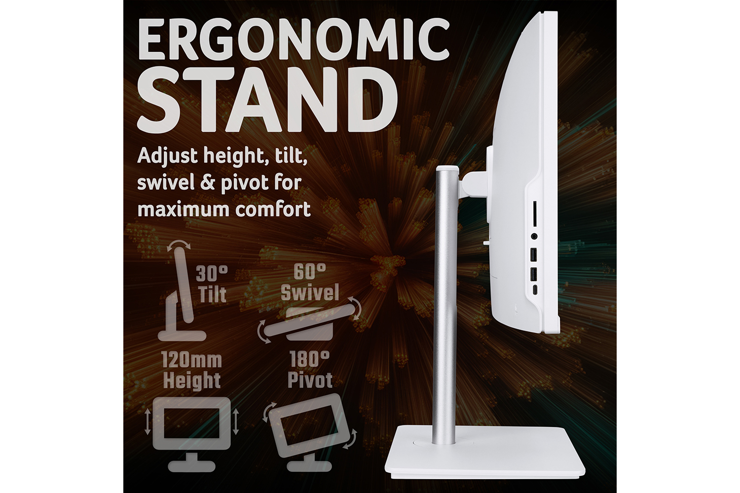 The 24-inch Full HD IPS display (1920 × 1080) with a smooth 120Hz refresh rate delivers vibrant colours and crisp detail — ideal for work, streaming and video calls. The adjustable stand allows you to tilt, pivot, swivel and raise the screen for the most comfortable viewing angle.
