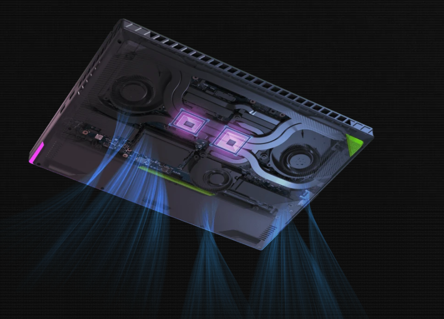 The Strix G16's comprehensive thermal design includes an extended heat spreader that absorbs heat from the CPU, GPU, VRAM, and VRM. With 7 heatpipes and an increase in total coverage from 26% to 33% of the motherboard compared to the previous design, this extensive thermal solution helps sustain and extend the overall performance, reliability, and lifespan of the system.