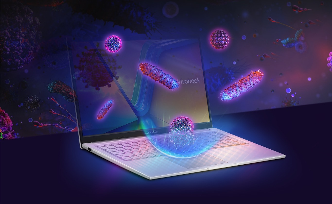 ASUS antimicrobial guard plus is a surface coating[13] on the laptop[14] that contains positively-charged silver ions. Silver ions and negatively-charged microbial cells are attracted to each other and then pierce the surface to damage their structure, inhibiting reproduction.
