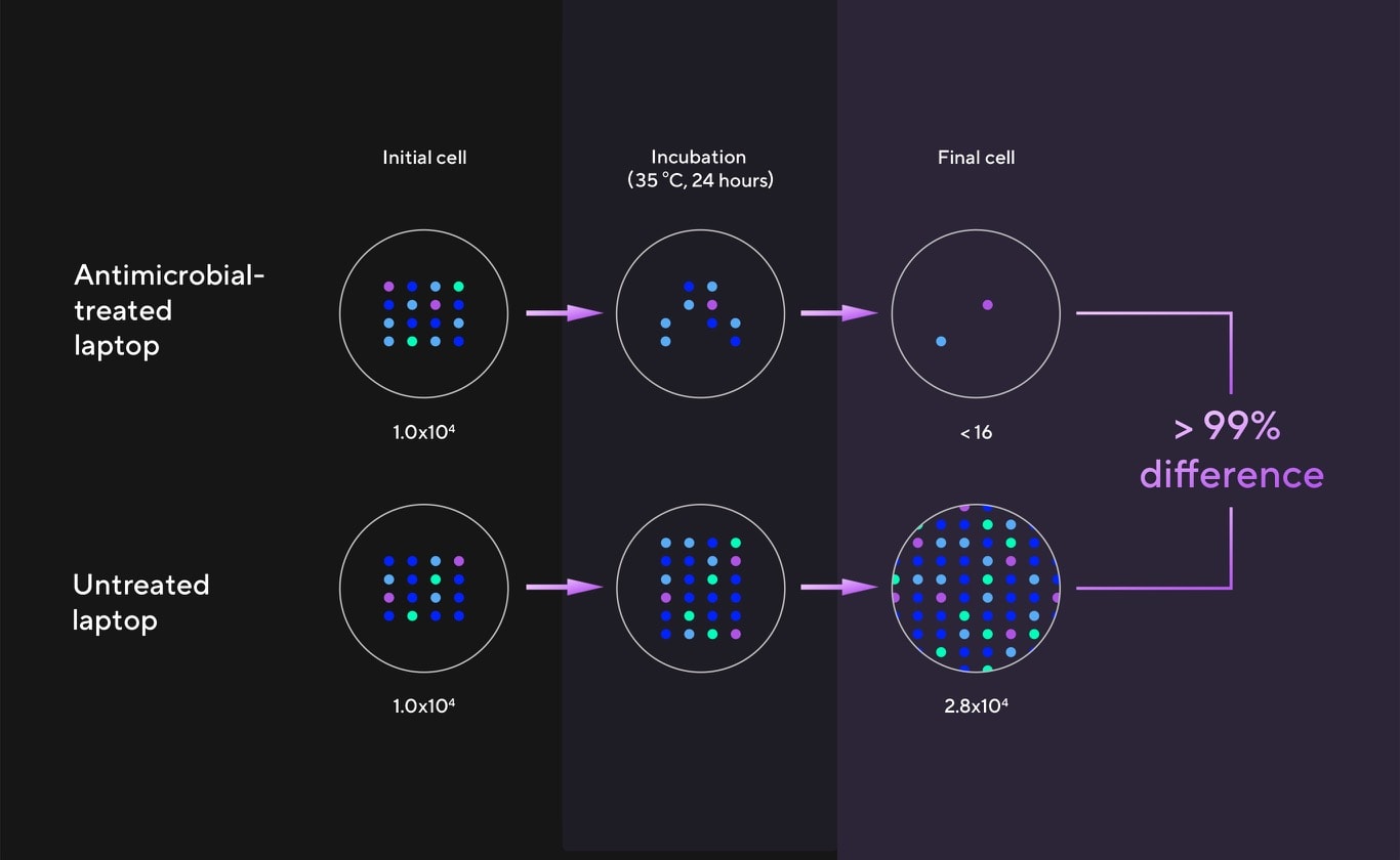 ASUS antimicrobial guard plus is applied to frequently touched areas of your laptop to help keep it hygienic. This technology uses a denser treatment* that inhibits viruses and bacteria. And it is scientifically shown — using the ISO 21702[5] and 22196[6] standards — to inhibit virus and bacteria growth by more than 99% over a 24-hour period4. Strains used for the tests include the SARS-CoV-2 (COVID-19), H3N2 (Influenza A) and the E. coli bacterium[7].