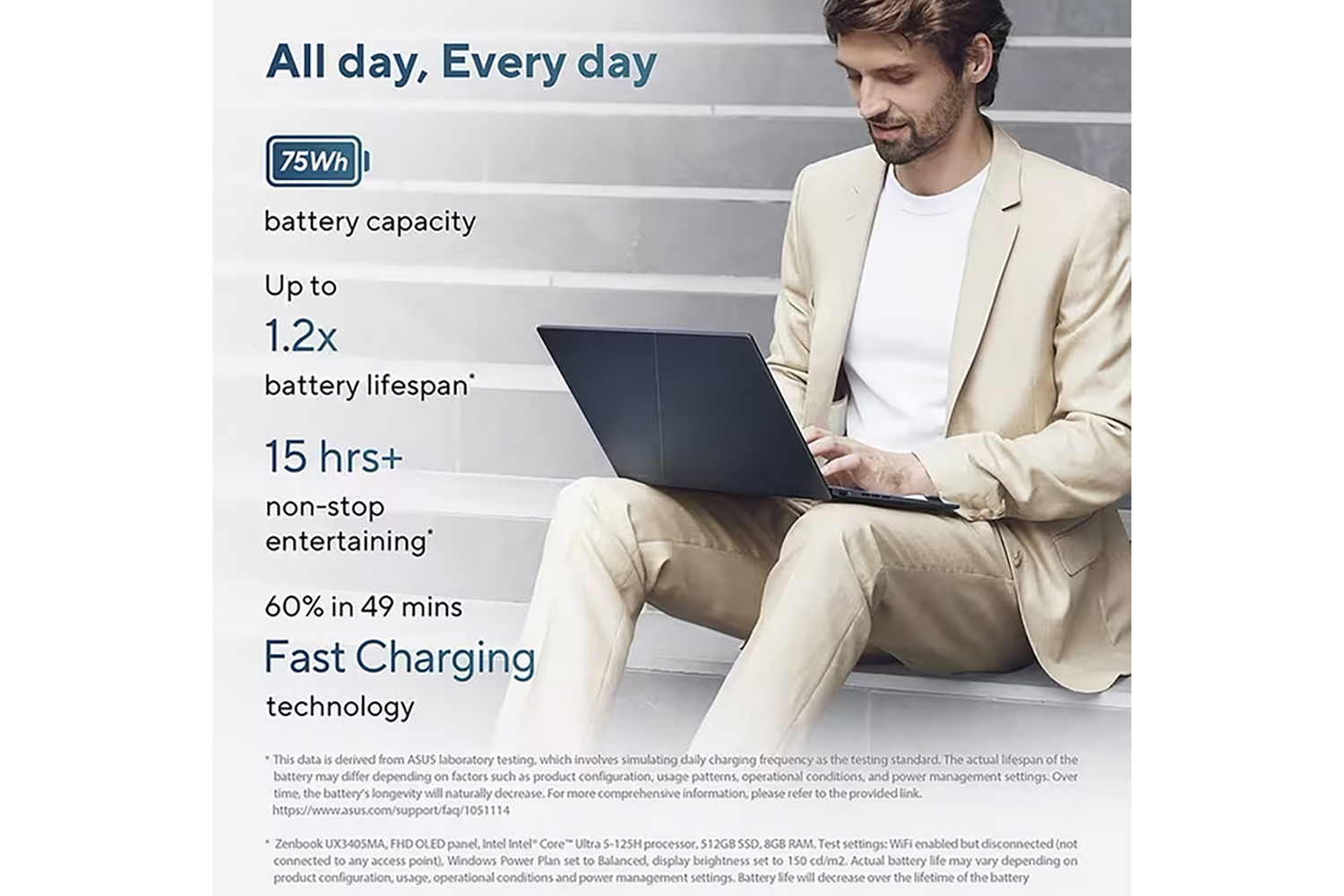 7. Performance claim is based on the Cinebench R23 Multi Core benchmark, comparing the score of Zenbook 14 UX3405MA tested by ASUS in Nov 2023 (configured with Intel Core Ultra 7 155H, 16 GB LPDDR5x RAM, a 1 TB PCIe 4.0 x4 SSD) and Zenbook 14 UX3402VA (with an Intel Core i7-1360P processor, 16 GB LPDDR5 RAM, and a 1 TB PCIe 4.0 x4 SSD). Test settings: select Performance mode under Fan profile in MyASUS, and idle the laptop for 10mins prior to running the benchmark under AC mode. It’s important to note that results may vary based on different specifications and testing environments.