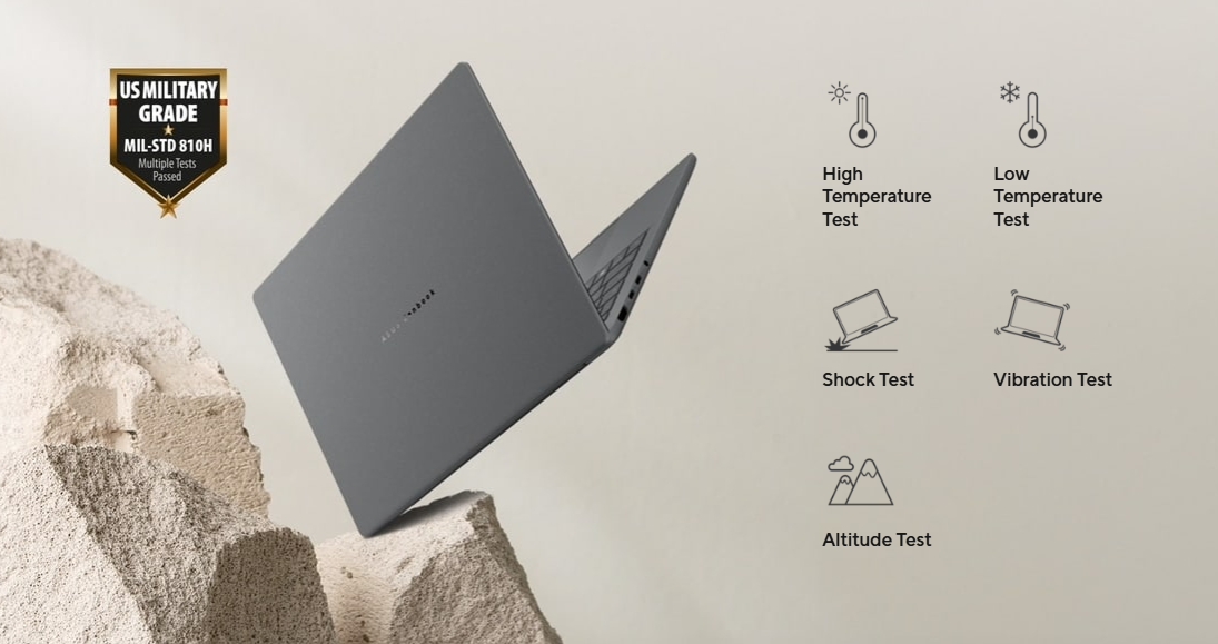 Zenbook A14 meets the ultra-demanding MIL-STD 810H military standard[6] for reliability and durability.