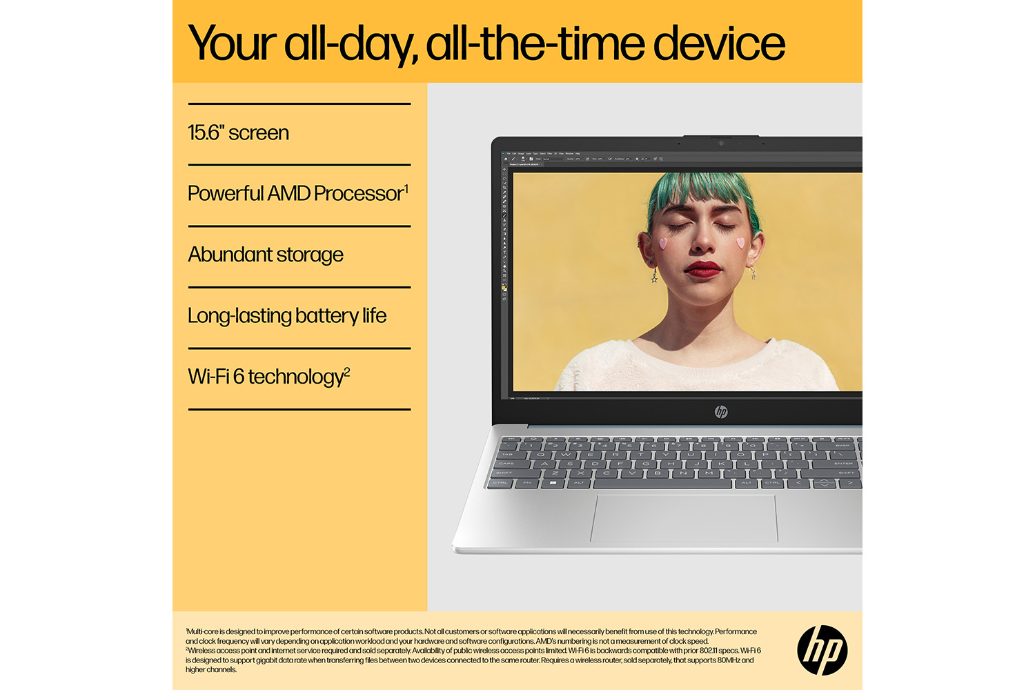 Face the day with an AMD Processor [1], long battery life, ample storage, and fast wireless connections.