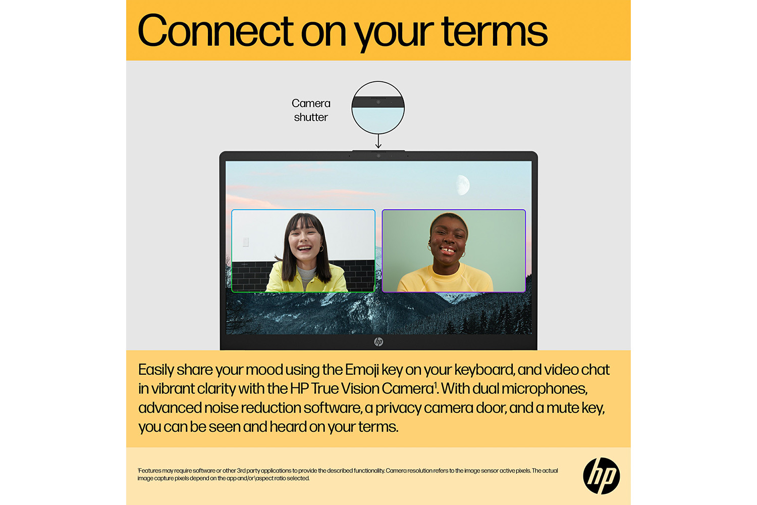 Be seen and heard clearly and securely with a HP True Vision camera [3] and background noisereducing microphones [4].