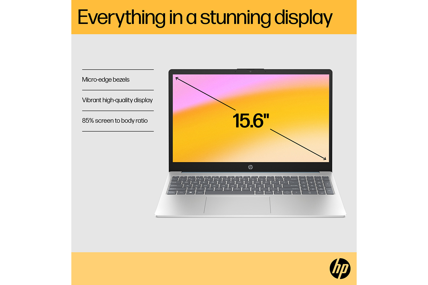 The HP 15.6" Laptop PC comes feature-packed for productivity and making your wallet-and the planet-happy. Built with recycled materials, this powerful HP laptop features an AMD Processor [1], ample storage, and mesmerizing graphics-plus, its 85% screen-to-body ratio [2] and 3-sided narrow bezel offer plenty of room to do and see more that matters.