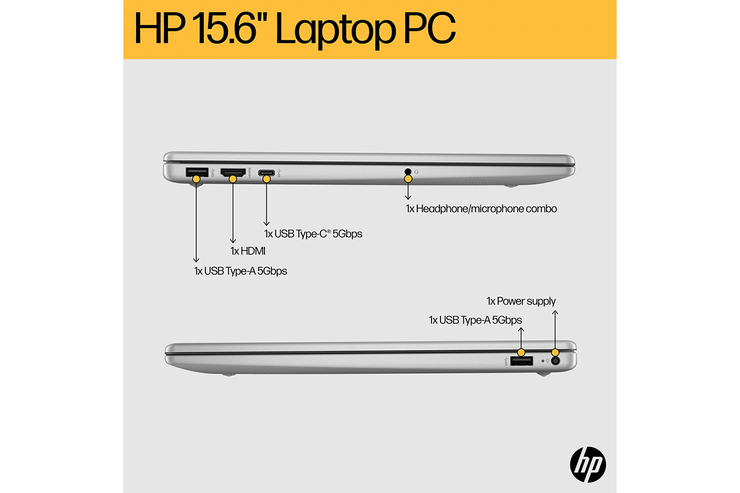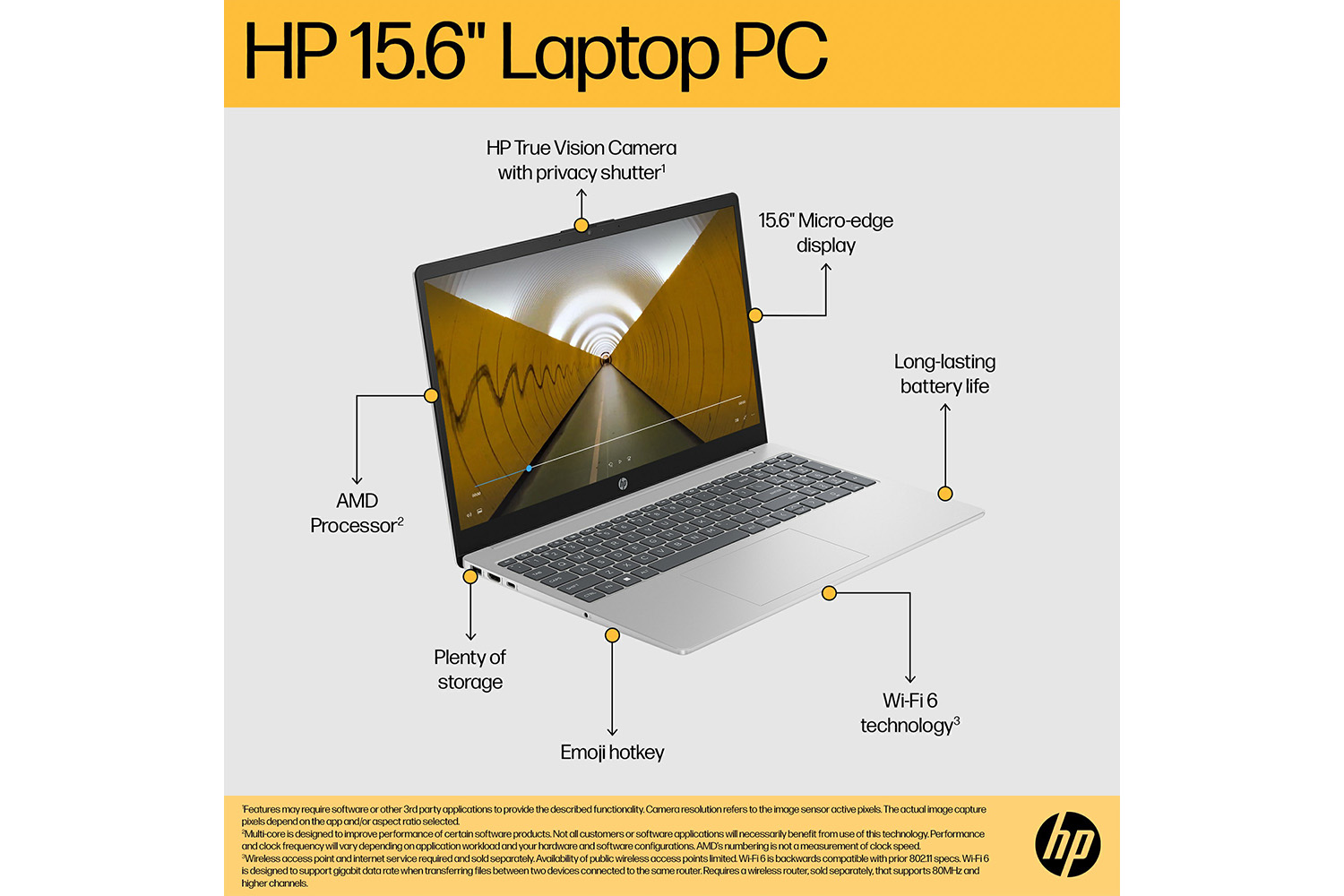 The HP 15.6" Laptop PC comes feature-packed for productivity and making your wallet-and the planet-happy. Built with recycled materials, this powerful HP laptop features an AMD Processor [1], ample storage, and mesmerizing graphics-plus, its 85% screen-to-body ratio [2] and 3-sided narrow bezel offer plenty of room to do and see more that matters.