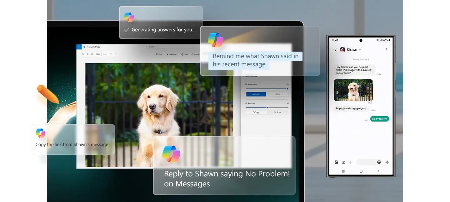 Stay on top of your tasks via quick chat prompts with Copilot's personalised AI assistance. Plus, get smarter communication tools — access contacts and send messages effortlessly from your PC or Samsung Galaxy mobile device with a simple chat command.