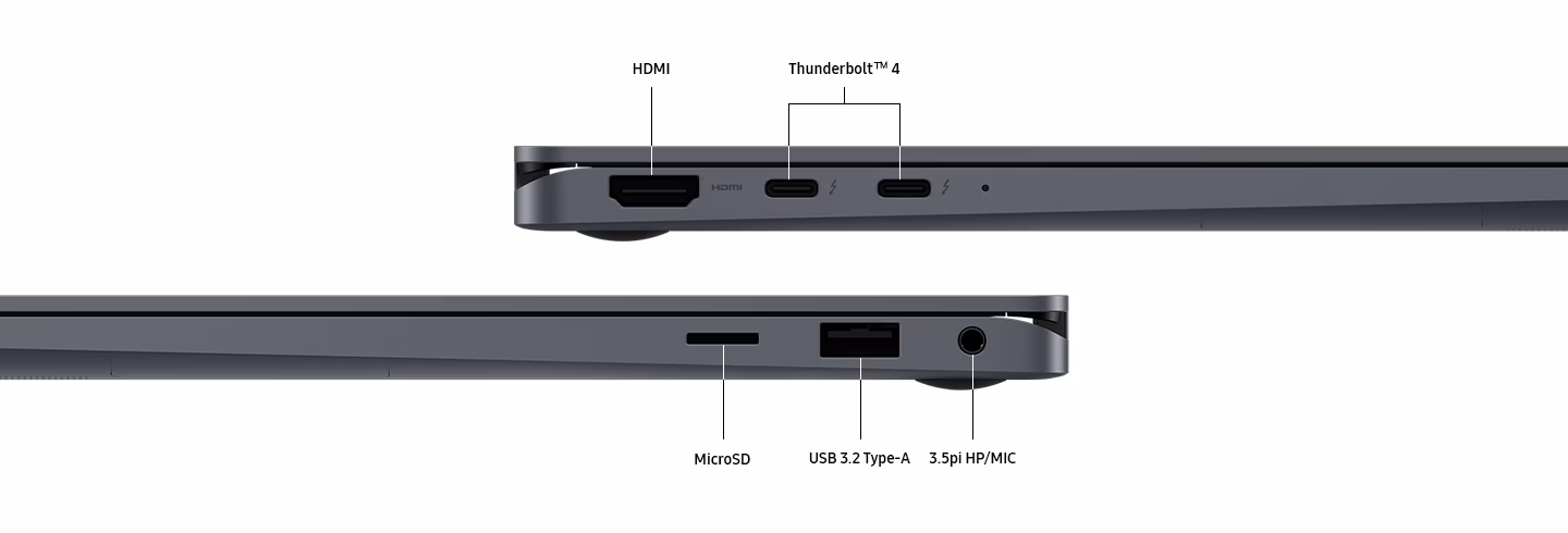 Versatile built-in ports let you hook up multiple devices to your Galaxy Book4 360, hassle and dongle-free. Enjoy lightning-fast data transfers with two Thunderbolt 4 ports and connect easily via HDMI, USB 3.2 Type-A, microSD and 3.5pi HP/MIC.