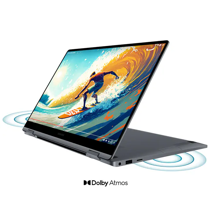 Upgrade your audio experience with the clear, deep sound of the dual-speaker system on Galaxy Book4 360. Both speakers are tuned with Dolby Atmos, delivering immersive surround sound from your favorite tracks and shows.