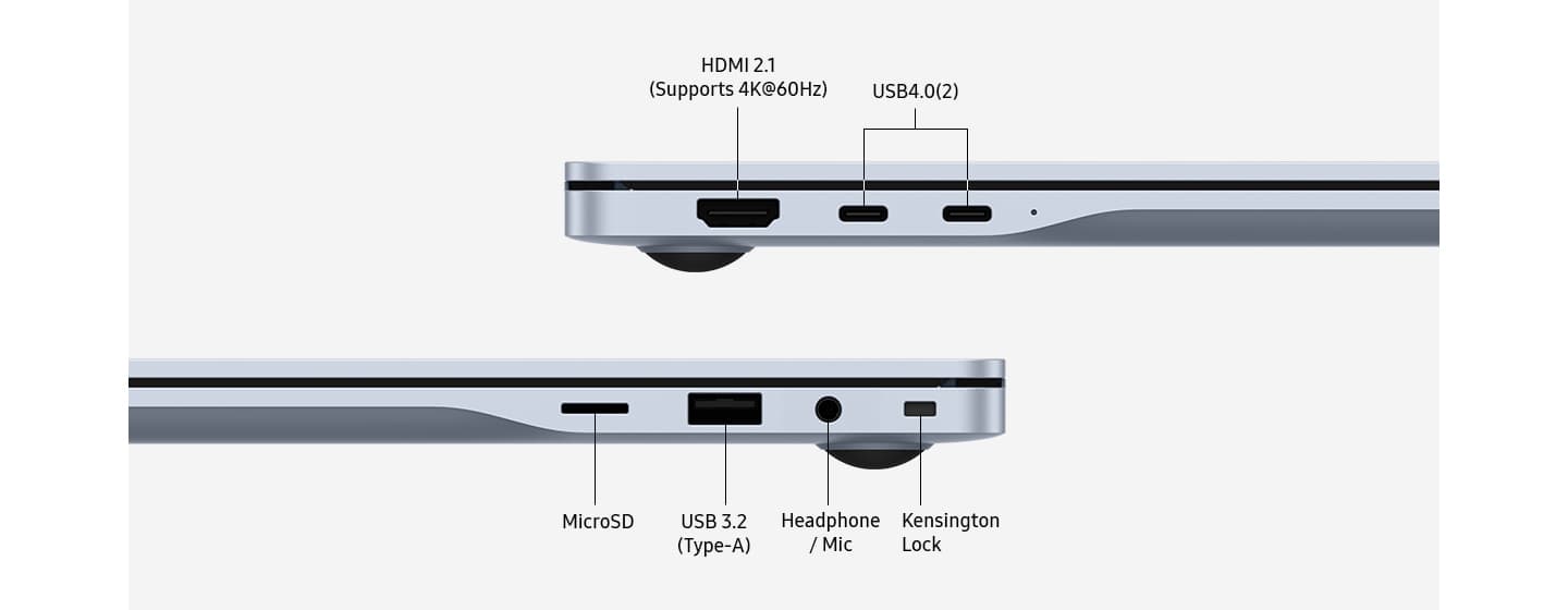 Versatile built-in ports let you hook up multiple devices to your Galaxy Book4 Edge 15.6" model, hassle and dongle-free. Enjoy lightning-fast data transfers with two USB 4.0 ports and connect easily via HDMI 2.1 (supports 4K at 60Hz), USB 3.2 Type-A, microSD card slot, Headphone/Mic and Kensington Lock. Plus, USB Type-C PD charging lets you power up your other compatible Galaxy devices quickly and conveniently.[9]