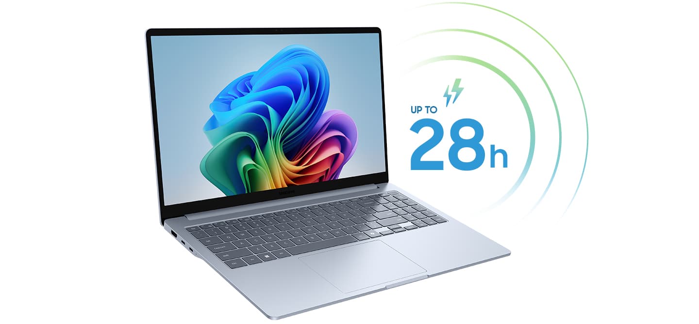 Whether you're on the job or on the go, Galaxy Book4 Edge 15.6" model's battery has the power you need, supporting up to 28 hours of video runtime. To top up, use Super Fast Charging to charge up to 44% in just about 30 minutes with the included charger.[10]