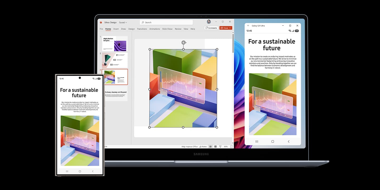 4. *Users must link their Samsung Galaxy device to their Windows PC through ‘Link to Windows’ on phone and the Microsoft Phone Link App on PC and follow the set-up prompts, including being signed into the same Microsoft account. *Link to Windows is preloaded on select Samsung Galaxy devices. PC (Microsoft Phone Link App) requires Windows 10 or above. Microsoft Phone Link recommends Samsung Galaxy device to be on the same Wi-Fi network as the PC. *Some mobile apps may restrict content to be shared on other screens. Some related features and availability Galaxy AI features may vary by device.*Samsung account login may be required for certain Samsung AI features.*Samsung does not make any promises, assurances or guarantees as to the accuracy, completeness or reliability of the output provided by AI features.*Images simulated for illustrative purposes. Sequences shortened. Actual UI may be different.*Galaxy AI features will be provided for free until the end of 2025 on supported Samsung Galaxy devices. Different terms may apply for AI features provided by third parties.