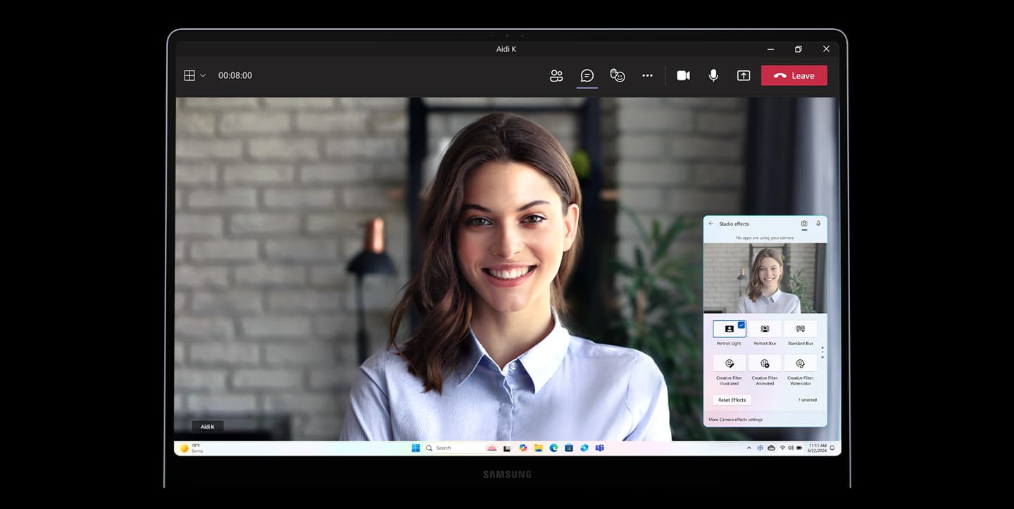 Put your best frame forward on video calls with Windows Studio Effects on Galaxy Book4 Edge. Touch up your appearance with AI features like Auto Framing, eye contact correction, enhanced lighting, background effects and filters, so you can look crisp and sound clear in meetings.[8]