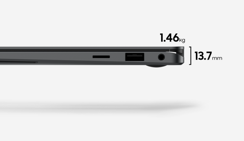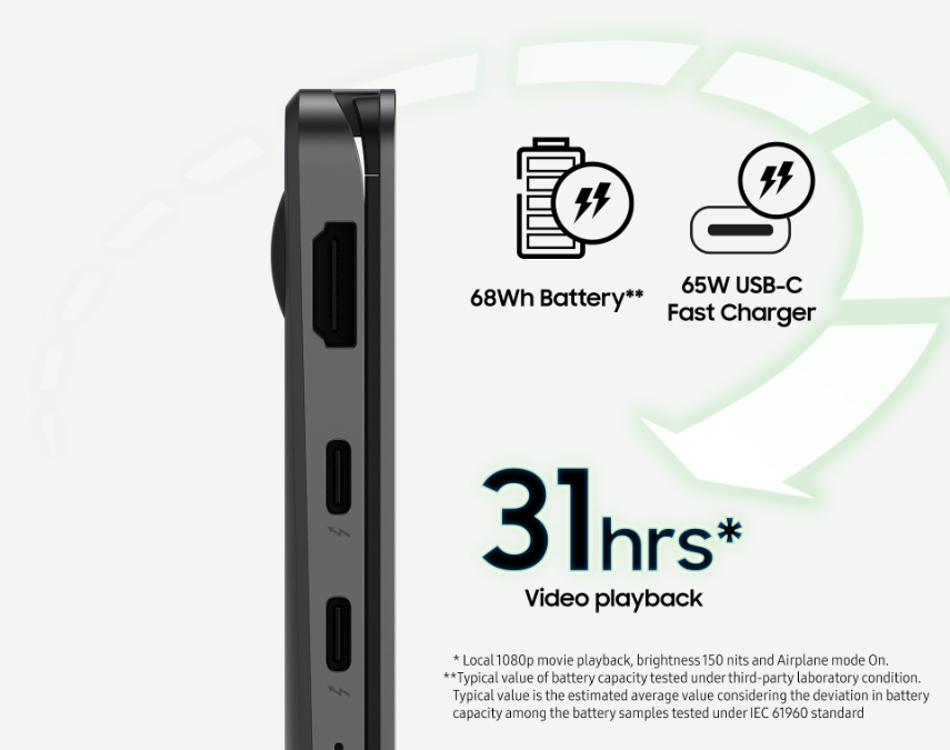 The Galaxy Book5 360 is designed for everyday versatility. Weighing just 1.46kg, it’s light enough for easy transport between home and the office and slips comfortably into a backpack. Equipped with Wi-Fi 7*, it ensures secure connections, clearer video calls, and faster browsing. It has all-day battery life, with up to 31 hours*. Plus, with Super-Fast Charging via the 65W USB-C, recharging the powerful 68Wh (typical) battery is quick and hassle-free too.