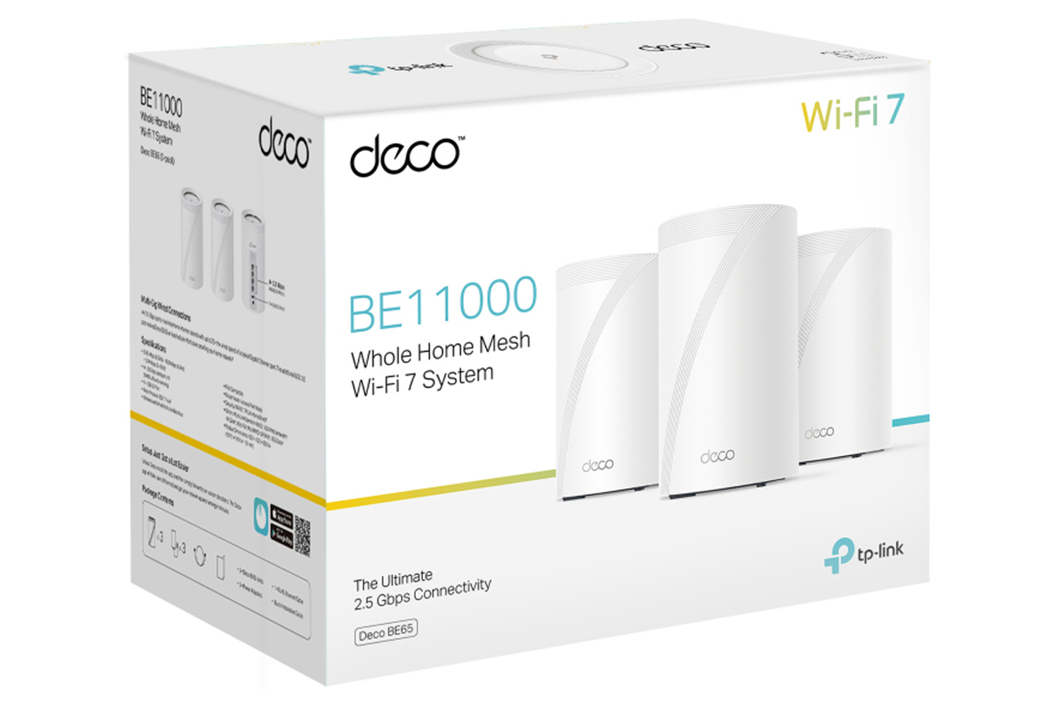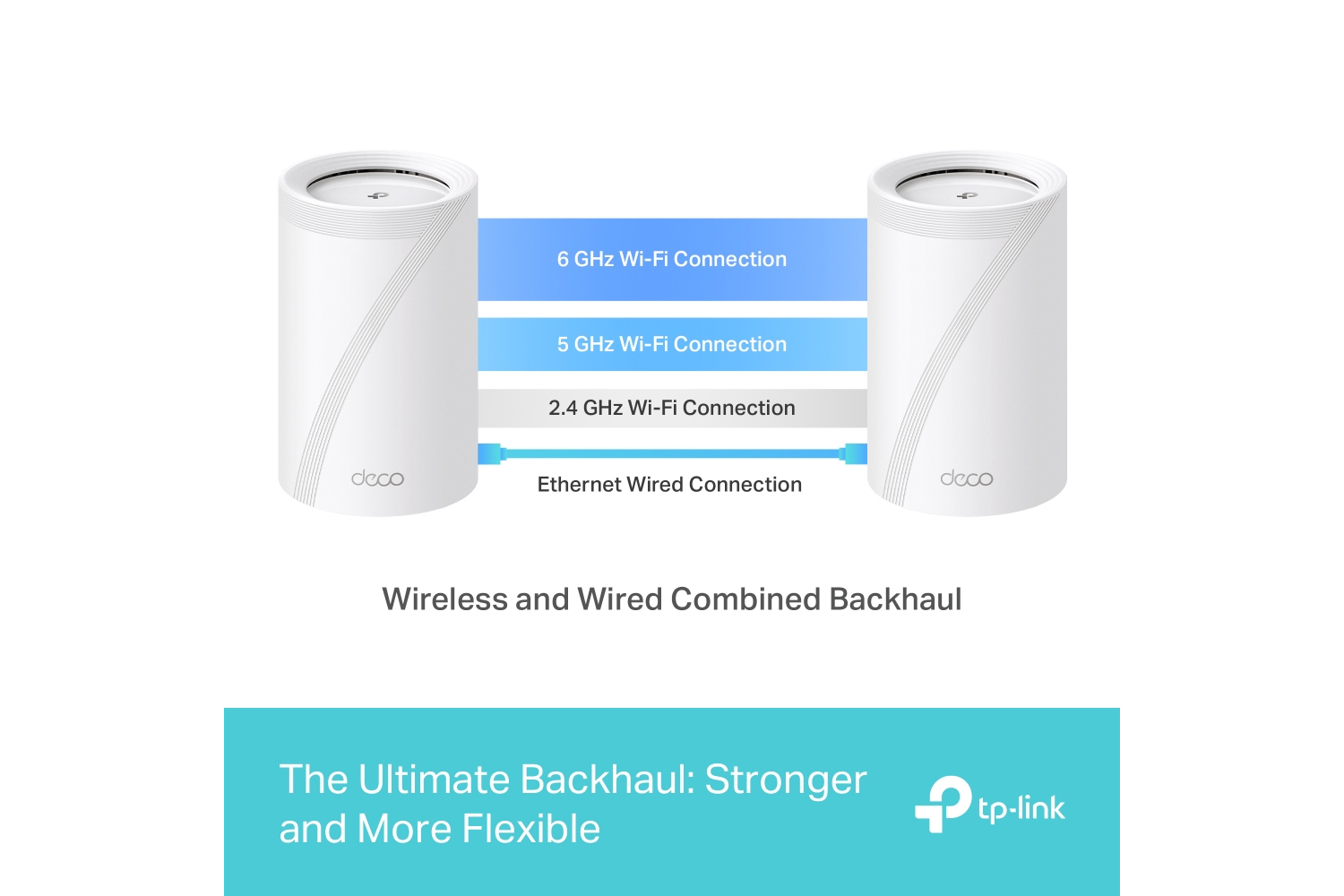 Through TP-Link self-developed technology, Deco BE65 can connect a wireless and wired backhaul with each unit simultaneously. What’s more, with the latest WiFi 7 MLO technology, the system’s wireless and wired combined backhaul aggregation flow rate is increased. This way, it greatly improves overall throughput and reduces latency, delivering broader coverage with more stable and reliable connections.