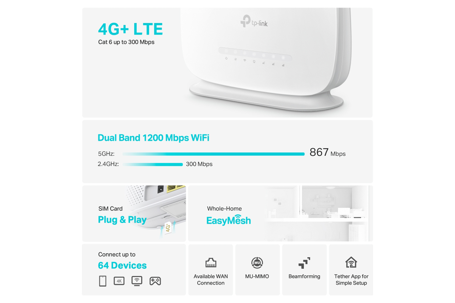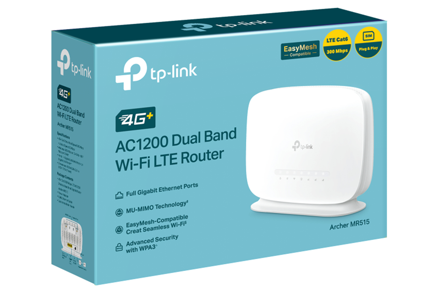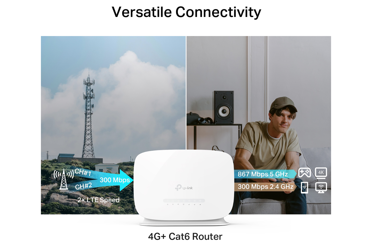 Thanks to 4G+ Carrier Aggregation technology which combines different carrier signals for even faster bandwidth, MR515 boosts 300 Mbps download speeds fulfills your devices’ needs. It can also share a dual-band Wi-Fi network with speeds of 867 Mbps on 5 GHz for bandwidth-intensive tasks like HD streaming and gaming and 300 Mbps on 2.4 GHz for internet surfing, email, and social media.