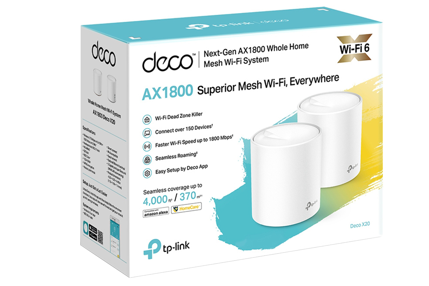 With clearer and stronger signals enhanced by BSS Color and Beamforming, Deco X20 boosts broader whole home Wi-Fi up to 5,800 ft2 (3-pack). Wireless connections and optional Ethernet backhaul work together to link Deco units, providing even faster network speeds and truly seamless coverage. Want more coverage Simply add another Deco.