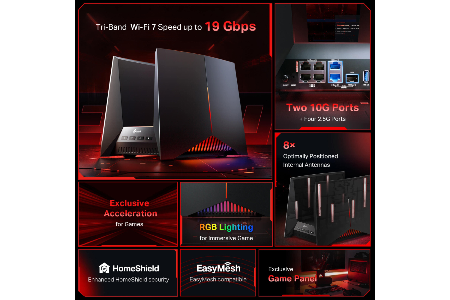 2× 10 Gbps WAN/LAN ports, and 4× 2.5 Gbps LAN ports support massive bandwidth for wired gaming devices and ultra-fast connections, accommodating all gaming needs