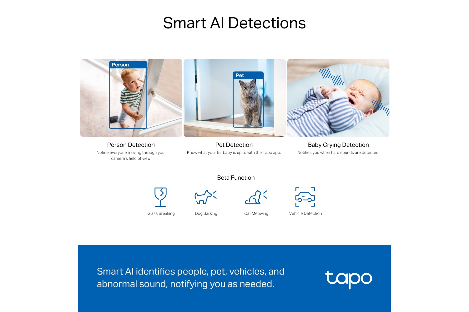 Smart AI identifies people, pets, and vehicles while recognizing a baby crying and other sounds, notifying users as needed.