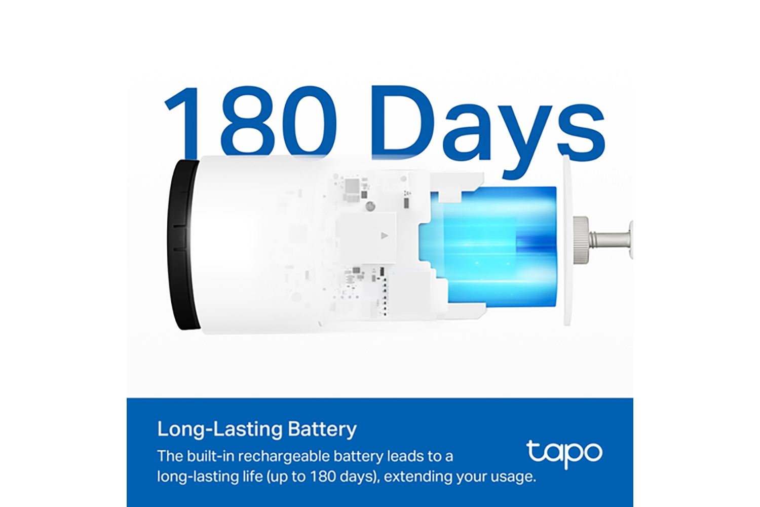 With its built-in rechargeable battery, Tapo C410 reduces the frequency of recharges, providing up to 180 days of uninterrupted performance on a single charge.