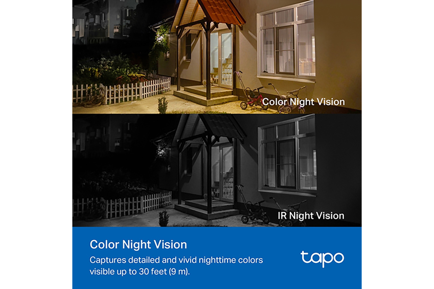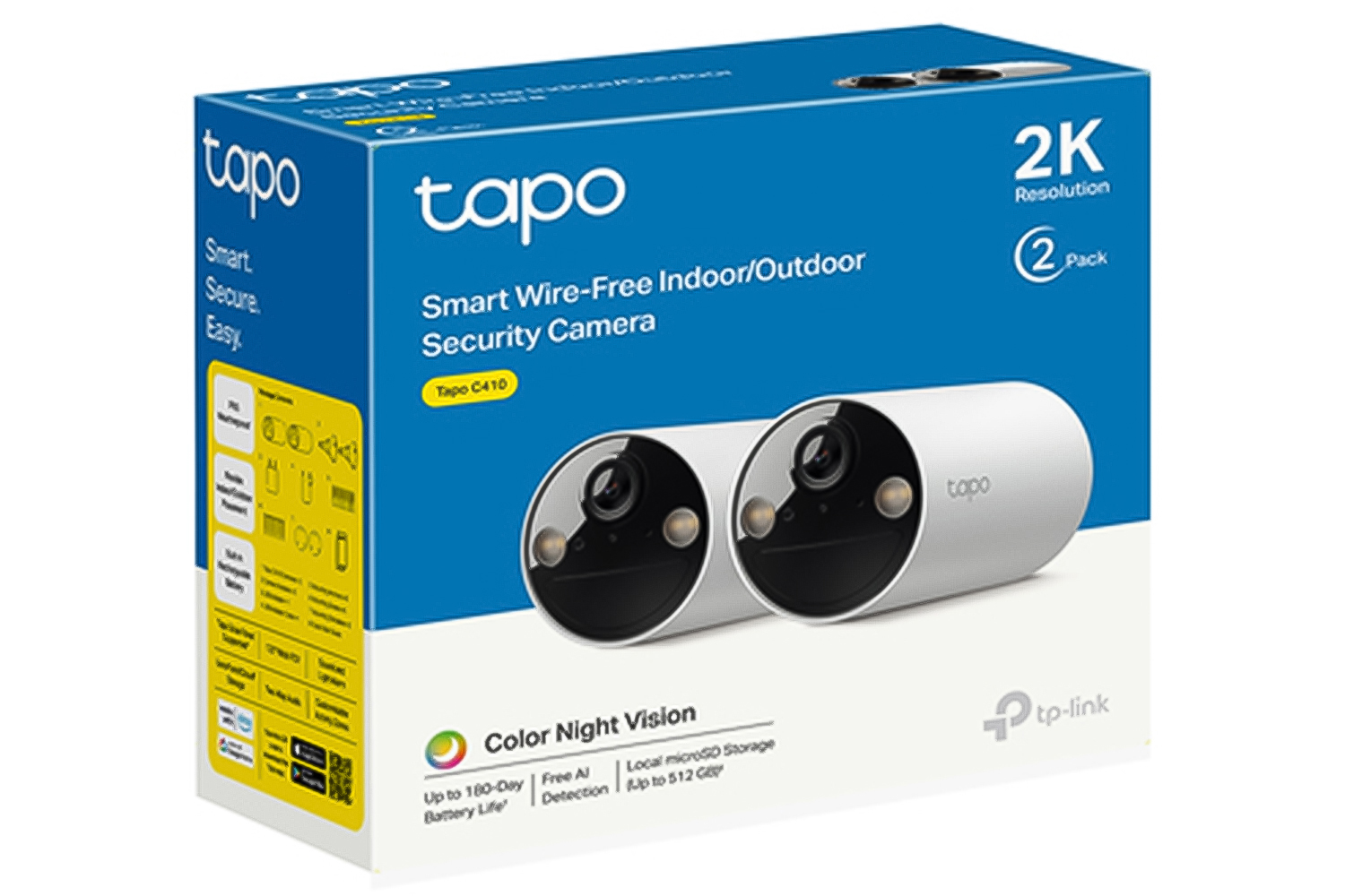Wire-Free, installs almost anywhere: Eliminates the need for outlets and enables flexible placement. add security to your home, wherever, wheneverSuperior 2k 3mp visuals: Capture every detail in crystal-clear 2k resolution, with advanced algorithms ensuring perfect exposure day and nightColor night vision: See the night in vivid colors with the large aperture lens and built-in spotlights effective up to 30 feet (9m)Extended battery life: With up to 180 days of security on a single charge, the tapo c410 minimizes maintenanceFlexible storage options: Choose from local microsd storage up to 512gb or the secure tapo care cloud service for additional peace of mindSmart person detection: Get alerts when a person is detected, reducing false alerts and unnecessary notificationsIntelligent phone notifications: Customize activity zones for precise motion detection and phone alerts, focusing on what truly mattersIp65 weatherproof: Offers excellent waterproof and dustproof performance for outdoor scenariosProduct Features
