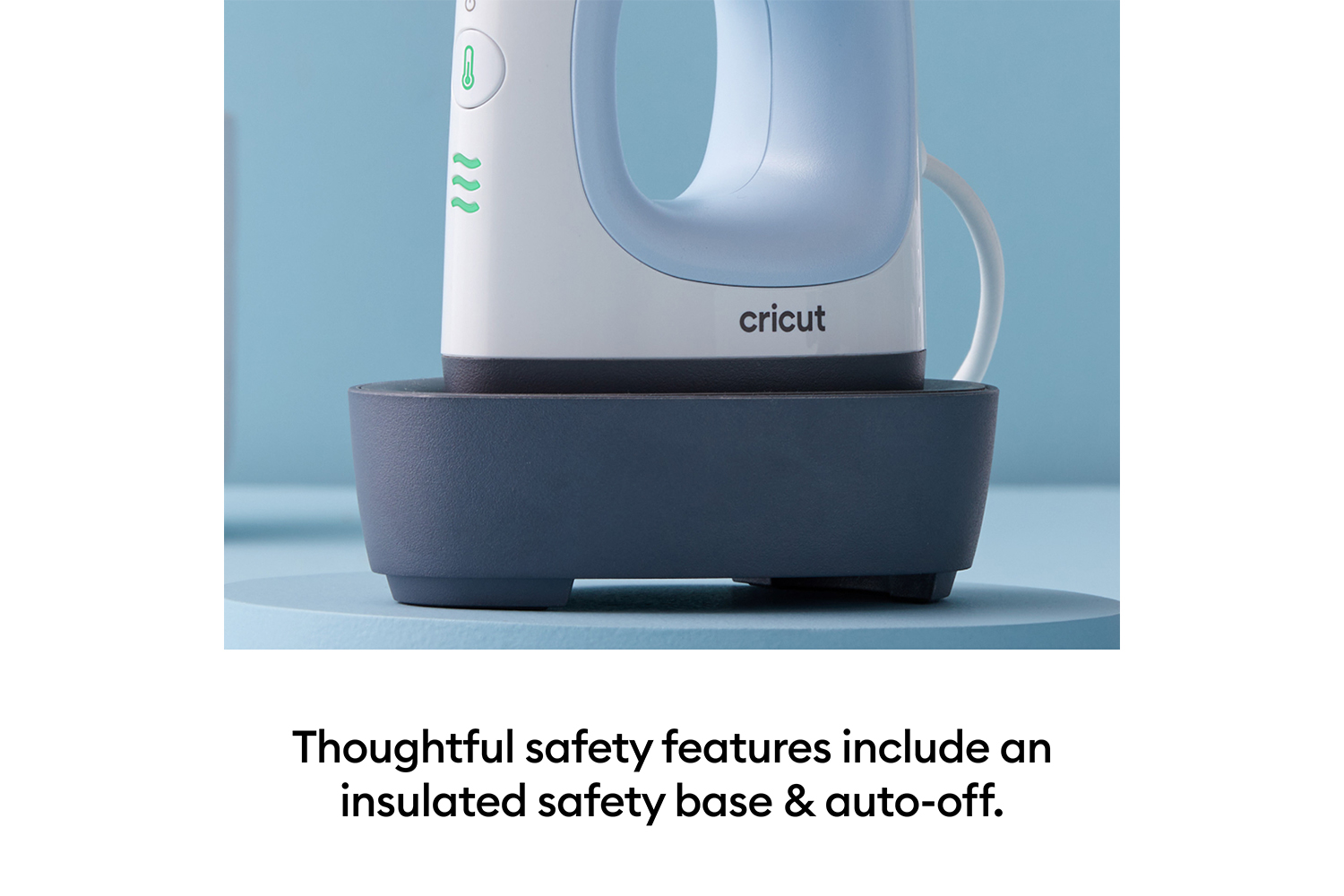 Safety features include an insulated resting base, an auto‑off function for peace of mind, and a ceramic‑coated plate that minimises accidental burns. Cricut products meet recognised safety standards including UL, CSA, FCC and IEC, and are tested and certified by Nationally Recognised Testing Labs (NRTLs) such as TUV and Intertek.