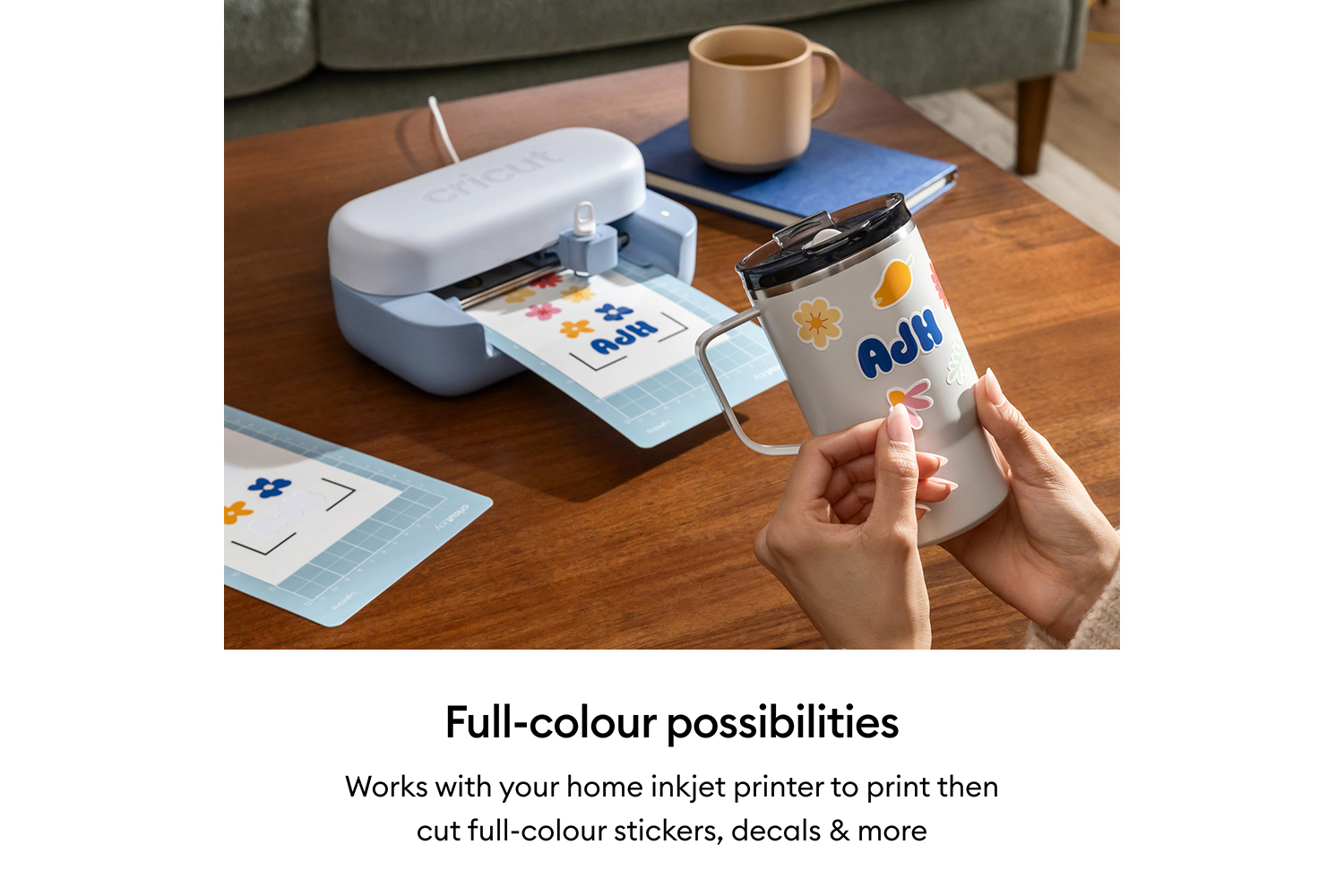 Print with your home inkjet, then Cricut Joy 2 recognises and precision‑cuts around printed images to make full‑colour stickers, decals, apparel and more.