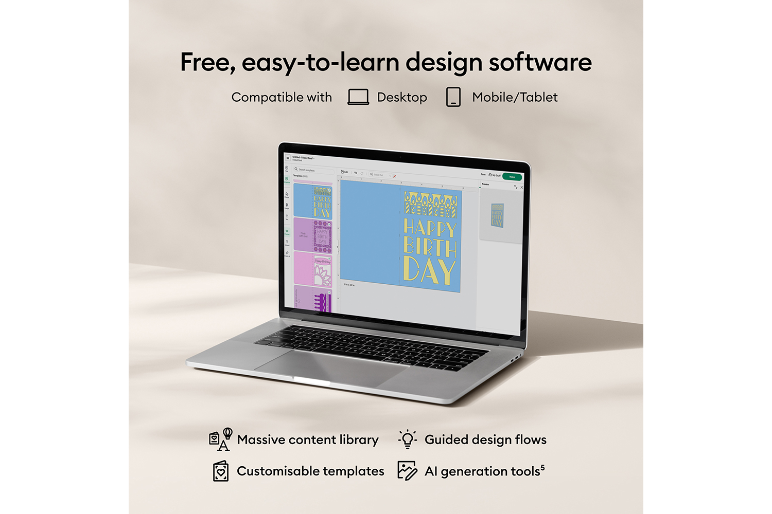 Use your mobile or desktop device [4] and connect via Bluetooth to Design Space, Cricut’s free, easy‑to‑use app with step‑by‑step flows, customisable templates, AI image generation [5] and a large content library for effortless personalisation.