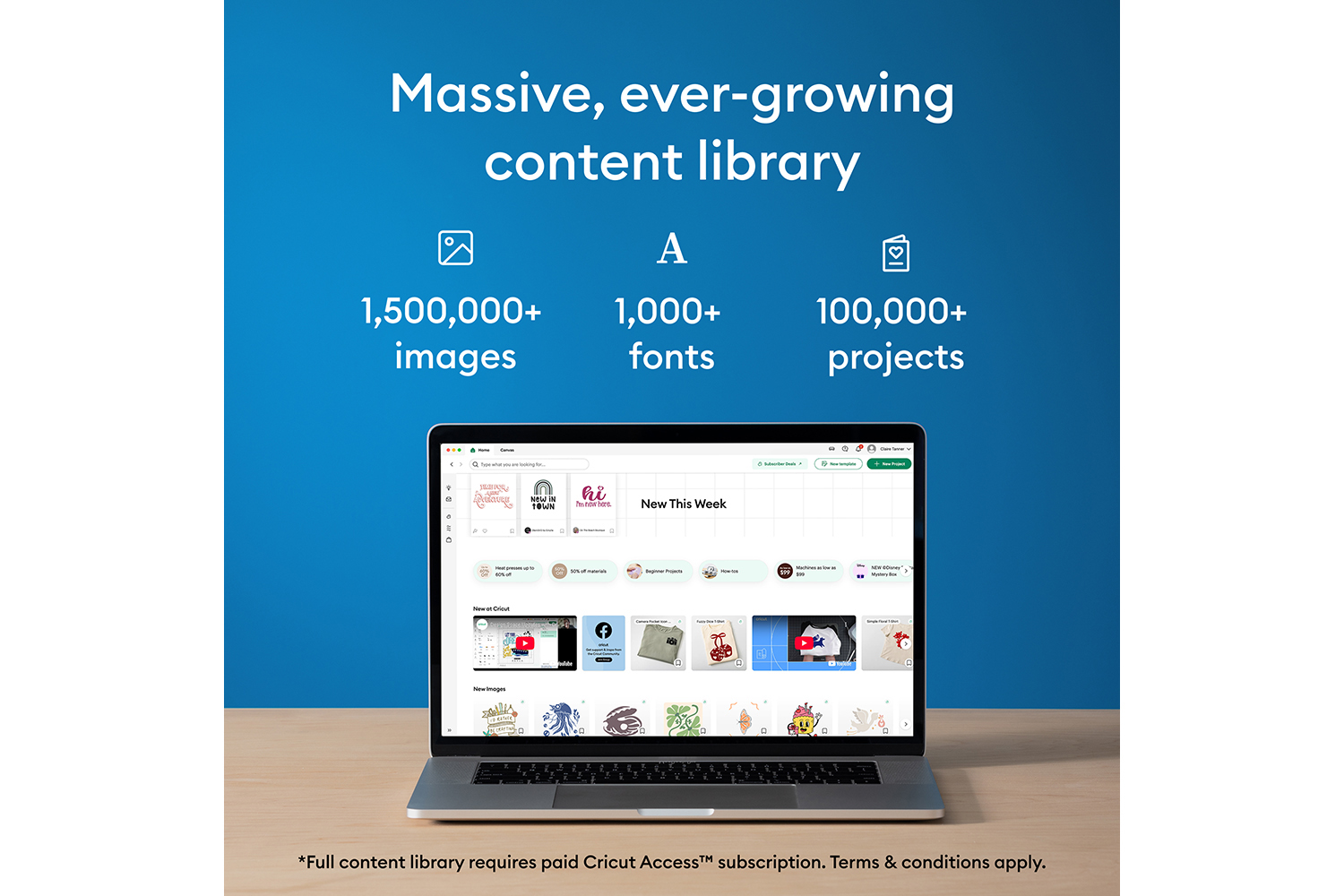 Cricut’s growing content library includes 1.5M+ images, 1,000+ fonts and 100,000+ projects—available with Cricut Access.