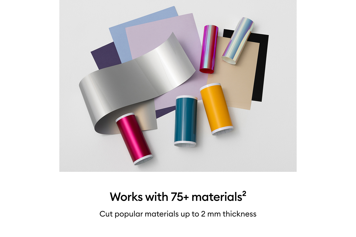 Works with 75+ materials [2] including vinyl, iron‑on (HTV), printable materials and cardstock. It can write, draw, foil, score and cut intricate designs with precision [3].