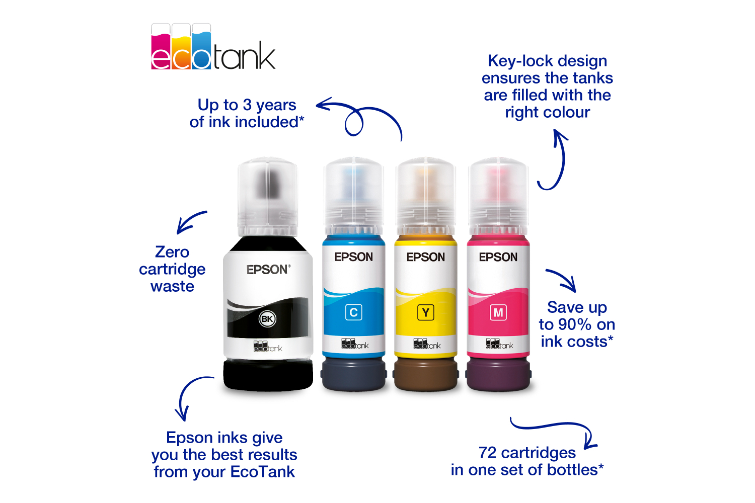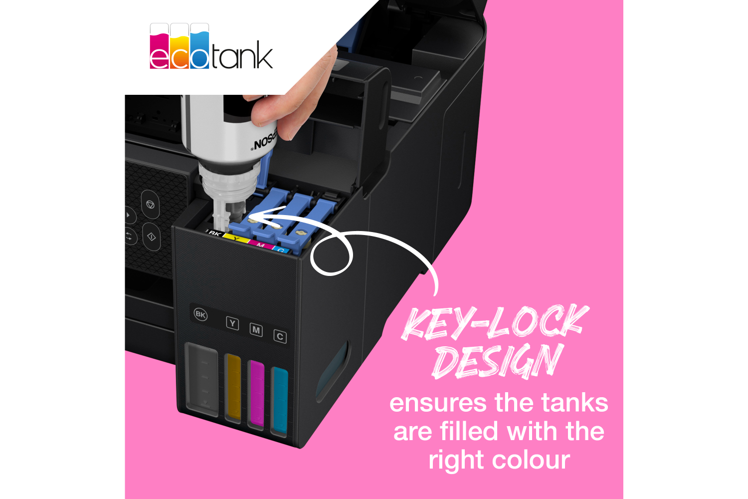 Epson's ink bottles are easier to use than ever before with the next generation design. The re-engineered bottles provide mess-free refills, and only allow the correct colour to be inserted into the corresponding tank.