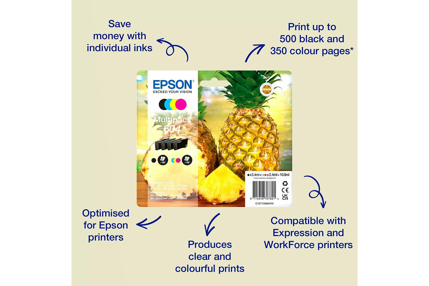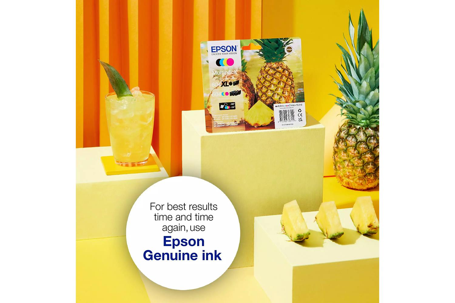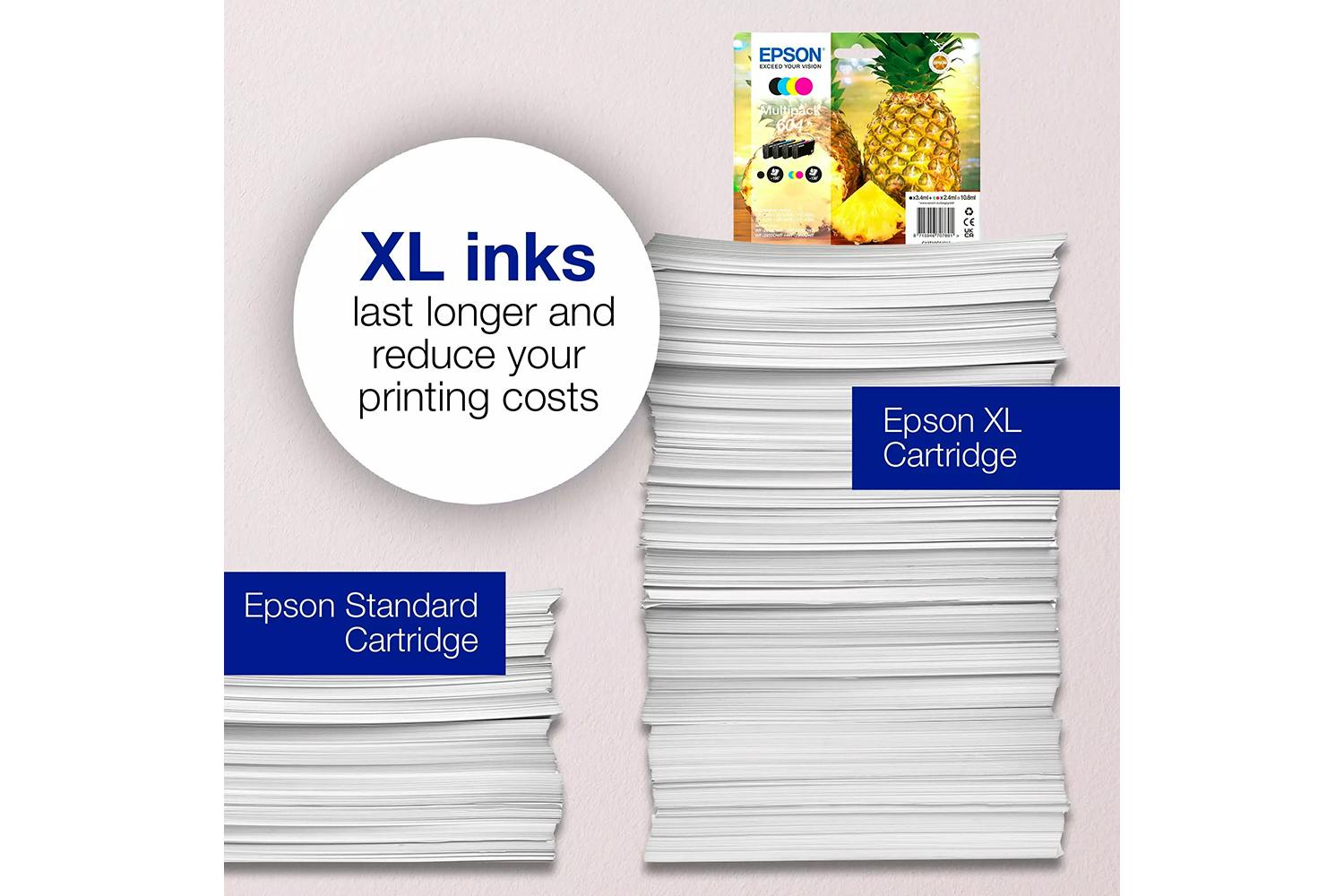 Epson's reliable four colour individual inks are ideal for everyday printing. There’s an affordable cartridge to suit every type of user, with both standard and XL sizes available in Single and Multipacks. Find them easily in store by looking for the Pineapple image.