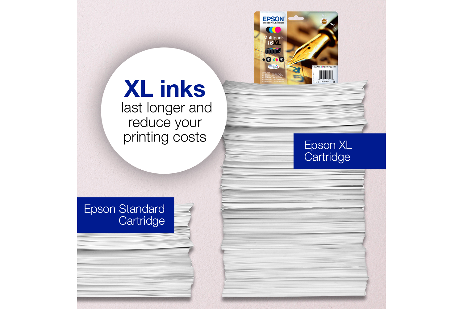 Epson offers a choice of standard or extra large (XL) ink cartridges across its latest ink ranges. XL inks are ideal if you print high volumes and can reduce your printing costs by up to 25%*.
